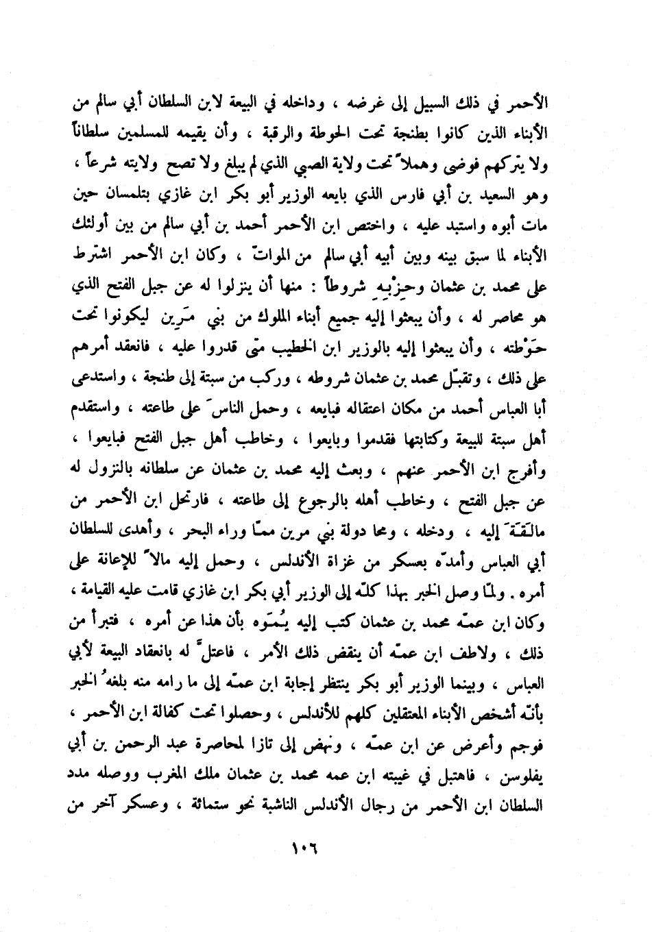 الأحمر في ذلك السبيل إلى غرضه، وداخله في البيعة لابن السلطان أبي سالم من الأبناء الذين كانوا بطنجة تحت الحوطة والرقبة، وأن يقيمه للمسلمين سلطاناً ولا يتركهم فوضى وهملاً تحت ولاية الصبي الذي لم يبلغ ولا تصح ولايته شرعاً، وهو السعيد ابن أبي فارس الذي بايعه الوزير أبو بكر ابن غازي بتلمسان حين مات أبوه واستبد عليه، واختص ابن الأحمر أحمد بن أبي سالم من بين أولئك الأبناء لما سبق بينه وبين أبيه أبي سالم من الموات، وكان ابن الأحمر اشترط على محمد بن عثمان وحزبه شروطاً: منها أن ينزلوا له عن جبل الفتح الذي هو محاصر له، وأن يبعثوا إليه جميع أبناء الملوك من بني مرين ليكونوا تحت حوطته، وأن يبعثوا إليه بالوزير ابن الخطيب متى قدروا عليه، فانعقد أمرهم على ذلك، وتقبل محمد بن عثمان شروطه، وركب من سبتة إلى طنجة، واستدعى أبا العباس أحمد من مكان اعتقاله فبايعه، وحمل الناس على طاعته، واستقدم أهل سبتة على البيعة وكتابتها فقدموا وبايعوا، وخاطب أهل جبل الفتح فبايعوا، وأفرج ابن الأحمر عنهم، وبعث إليه محمد بن عثمان عن سلطانه بالنزول له عن جبل الفتح، وخاطب أهله بالرجوع إلى طاعته، فارتحل ابن الأحمر من مالقة إليه، ودخله، ومحا دولة بني مرين مما وراء البحر، وأهدى للسلطان أبي العباس وأمده بعسكر من غزاة الأندلس، وحمل إليه مالاُ للإعانة على أمره. ولما وصل الخبر بهذا كله إلى الوزير أبي بكر ابن غازي قامت عليه القيامة، وكان ابن عمه محمد بن عثمان كتب إليه يموه بأن هذا عن أمره، فتبرأ من ذلك، ولاطف ابن عمه أن ينقض ذلك الأمر، فاعتل له بانعقاد البيعة لأبي العباس، وبينما الوزير أبو بكر ينتظر إجابة ابن عمه إلى ما رامه منه بلغه الخبر بأنه أشخص الأبناء المعتقلين كلهم إلى الأندلس، وحصلوا تحت كفالة ابن الأحمر، فوجم وأعرض عن ابن عمه، ونهض إلى تازا لمحاصرة عبد الرحمن ابن أبي يفلوسن، فاهتبل في غيبته ابن عمه محمد بن عثمان ملك المغرب ووصله مدد السلطان ابن الأحمر من رجال الأندلس الناشبة نحو ستمائة، وعسكر آخر من