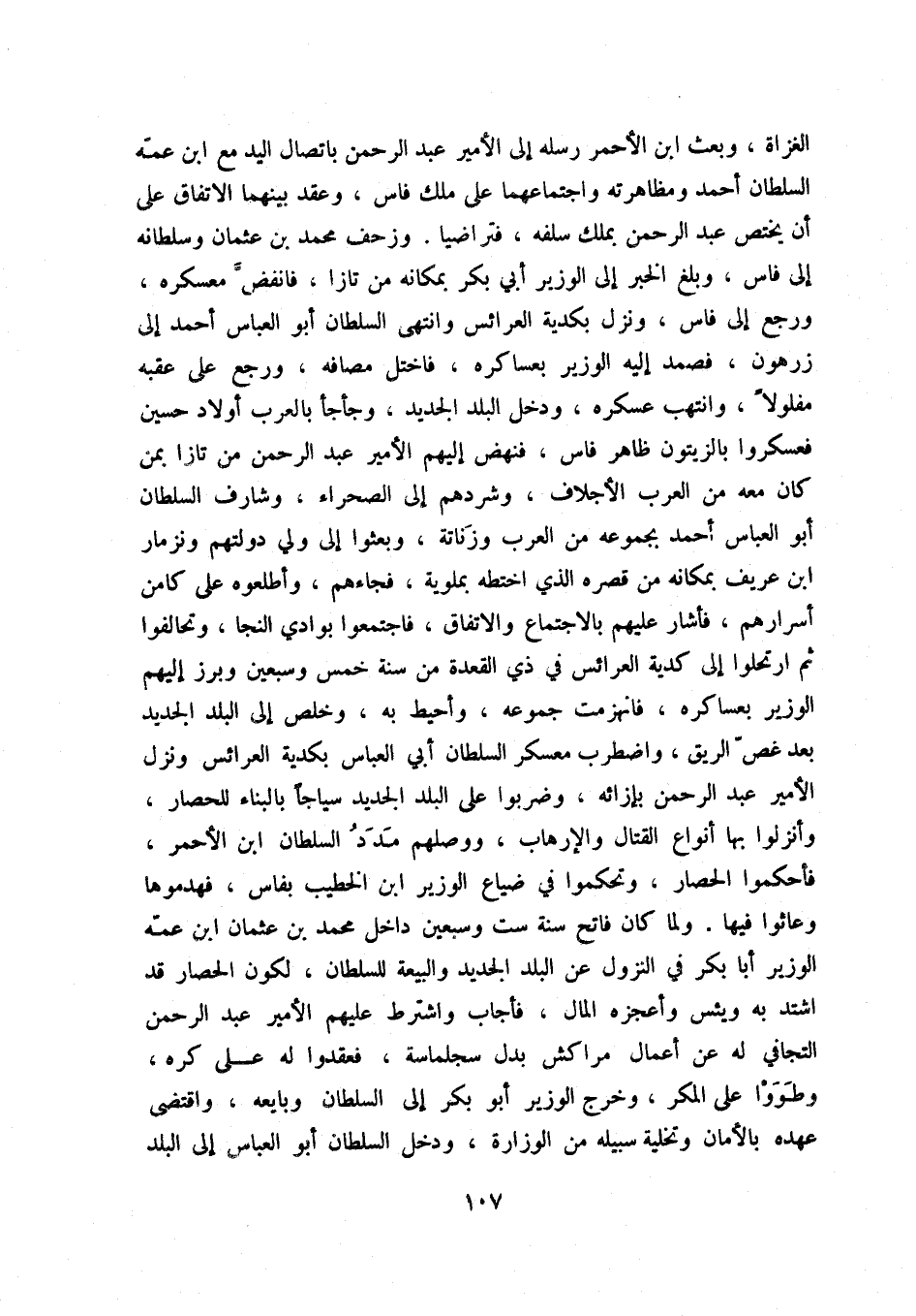 وزحف محمد بن عثمان وسلطانه إلى فاس، وبلغ الخبر إلى الوزير أبي بكر بمكانه من تازا، فانفض معسكره، ورجع إلى فاس، ونزل بكدية العرائس وانتهى السلطان أبو العباس احمد إلى زرهون، فصمد إليه الوزير بعساكره، فاختل مصافه، ورجع على عقبه مفلولاُ، وانتهب عسكره، ودخل البلد الجديد، وجأجأ بالعرب أولاد حسين فعسكروا بالزيتون ظاهر فارس، فنهض إليهم الأمير عبد الرحمن من تازا بمن كان معه من العرب الأجلاف، وشردهم إلى الصحراء، وشارف السلطان أبو العباس أحمد بجموعه من العرب وزناتة، وبعثوا إلى ولي دولتهم ونزمار ابن عريف بمكانه من قصره الذي اختطه بملوية، فجاءهم، وأطلعوه على كامن أسرارهم، فأشار عليهم بالاجتماع والاتفاق، فاجتمعوا بوادي النجا، وتحالفوا ثم ارتحلوا إلى كدية العرائس في ذي القعدة من سنة خمس وسبعين وبرز إليهم الوزير بعساكره، فانهزمت جموعه، وأحيط به، وخلص إلى البلد الجديد بعد غص الريق، واضطرب معسكر السلطان أبي البعباس بكدية العرائس ونزل الأمير عبد الرحمن بإزاءه، وضربوا على البلد الجديد سياجاً بالبناء للحصار، وأنزلوا بها أنواع القتال والإرهاب، ووصلهم مدد السلطان ابن الأحمر، فأحكموا الحصار، وتحكموا في ضياع الوزير ابن الخطيب بفاس، فهدموها وعاثوا فيها، ولما كان فاتح سنة ست وسبعين داخل محمد بن عثمان ابن عمه الوزير أبا بكر في النزول عن البلد الجديد والبيعة للسلطان، لكون الحصار قد اشتد به ويئس وأعجزه المال، فأجاب واشترط عليهم الأمير عبد الرحمن التجافي لهم عن أعمال مراكش بدل سجلماسة، فعقدوا له على كره، وطووا على المكر، وخرج الوزير أبو بكر إلى السلطان وبايعه، واقتضى عهده بالأمان وتخلية سبيله من الوزارة، ودخل السلطان أبو العباس إلى البلد