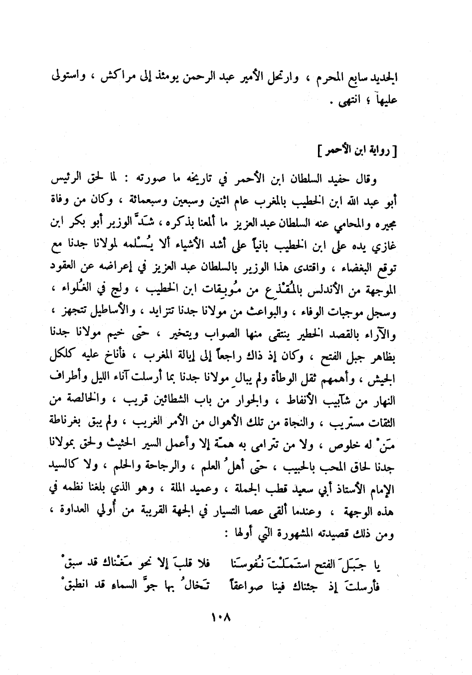 وقال حفيد السلطان ابن الأحمر في تاريخه ما صورته: لما لحق الرئيس أبو عبد الله ابن الخطيب بالمغرب عام اثنين وسبعين وسبعمائة، وكان من وفاة مجيره والمحامي عنه السلطان عبد العزيز ما ألمعنا بذكره، شد الوزير أبو بكر ابن غازي يده على ابن الخطيب بانياً على أشد الأشياء ألا يسلمه لمولانا جدنا مع توقع البغضاء، واقتدى هذا الوزير بالسلطان عبد العزيز في إعراضه عن العقود الموجهة من الأندلس بالمقذع من موبقات ابن الخطيب، ولج في الغلواء، وسجل موجبات الوفاء، والبواعث من مولانا جدنا تتزايد، والأساطيل تتجهز، والآراء بالقصد الخطير ينتقى منها الصواب ويتخير، حتى خيم مولانا جدنا بظاهر جبل الفتح، وكان إذ ذاك راجعاً إلى إيالة المغرب، فأناخ عليه كلكل الجيش، وأهمهم ثقل الوطأة ولم يبال مولانا جدنا بما أرسلت آناء الليل وأطراف النهار من شآبيب الأنفاط، والجوار من باب الشطائين قريب، والخالصة من الثقات مستريب، والنجاة من تلك الأهوال من الأمر الغريب، ولم يبق بغرناطة من له خلوص، ولا من تترامى به همة إلا وأعمل السير الحثيث ولحق بمولانا جدنا لحاق المحب بالحبيب، حتى أهل العلم، والرجاحة والحلم، ولا كالسيد الإمام الأستاذ أبي سعيد قطب الجملة، وعميد الملة، وهو الذي بلغنا نظمه في هذه الوجهة، وعندما ألقى عصا التسيار في الجهة القريبة من أولي العداوة، ومن ذلك قصيدته المشهورة التي أولها: