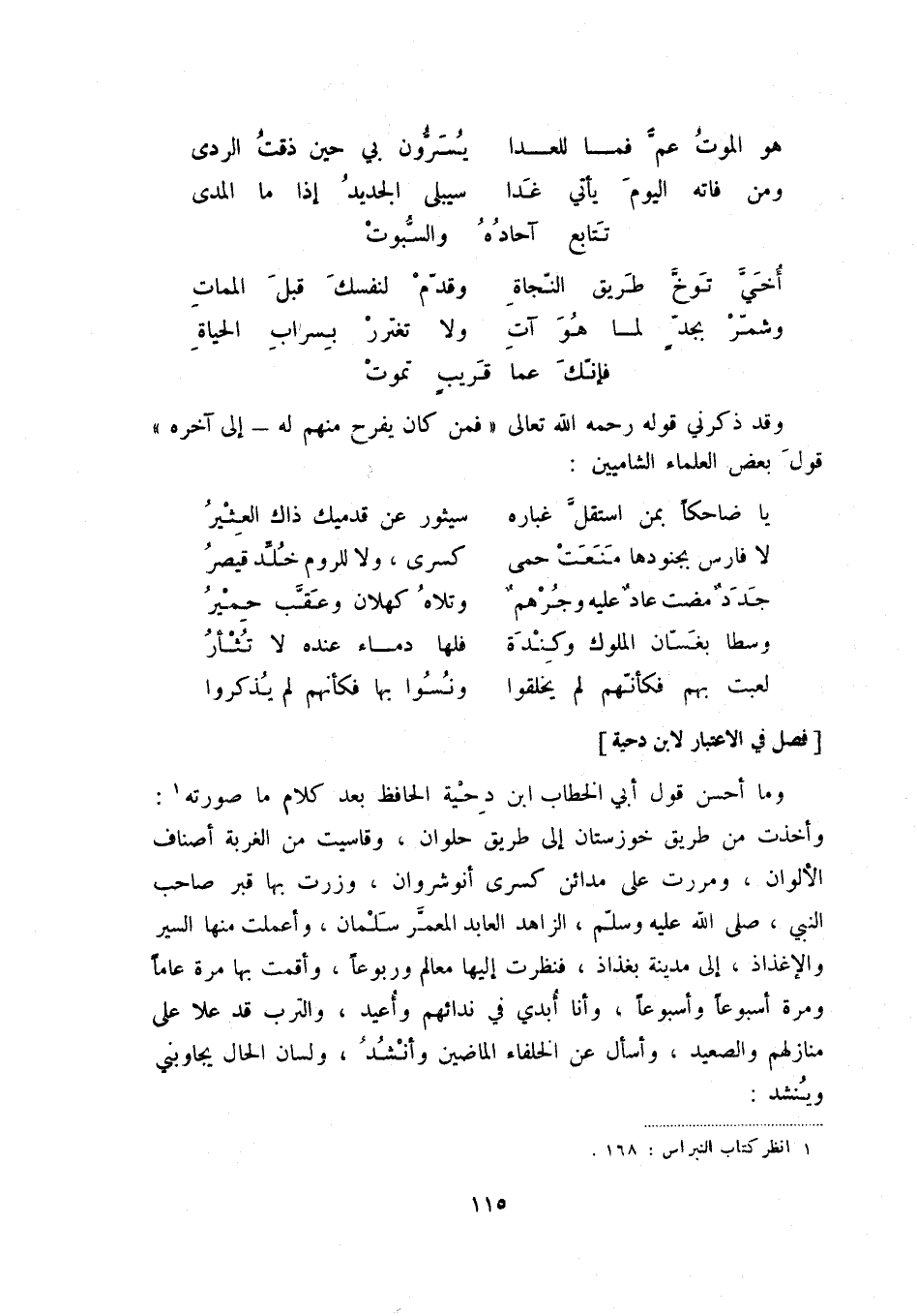 وما أحسن قول أبي الخطاب ابن دحية الحافظ بعد كلام ما صورته (1) : وأخذت من طريق خوزستان إلى طريق حلوان، وقاسيت من الغربة أصناف الألوان، ومررت على مدائن كسرى أنوشروان، وزرت بها قبر صاحب النبي، صلى الله عليه وسلم، الزاهد العابد المعمر سلمان، وأعملت بها السير والإغذاذ، إلى مدينة بغذاذ، فنظرت إليها معالم وربوعاً، وأقمت بها مرة عاماً ومرة أسبوعاً وأسبوعا، وأنا ابدي في ندائهم وأعيد، والترب قد علا على منازلهم والصعيد، وأسأل عن الخلفاء الماضين وأنشد، ولسان الحال يجاوبني وينشد: