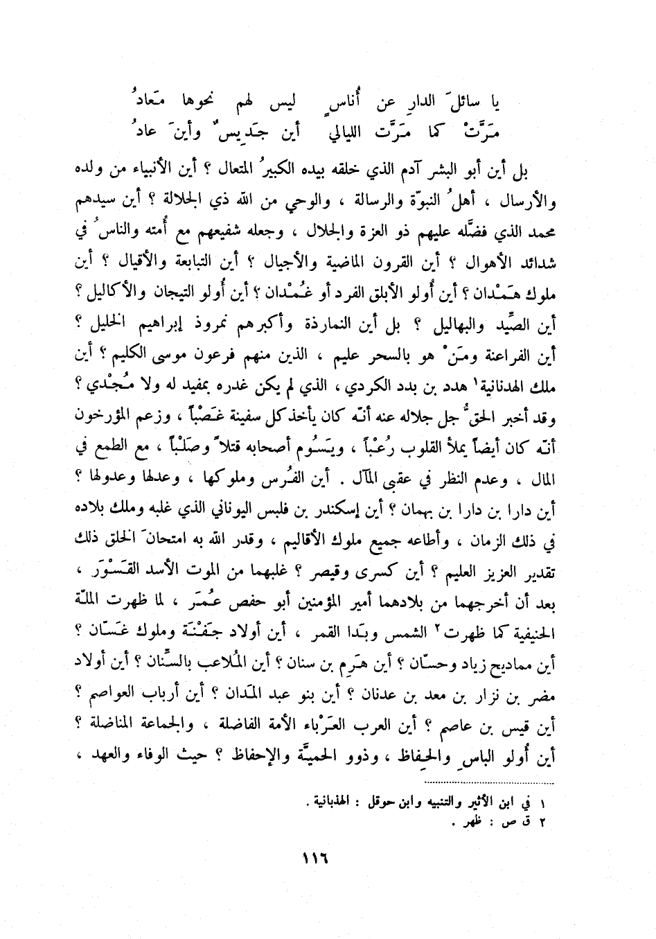 مرت كما مرت الليالي ... أين جديس وأين عاد بل أين البشر آدم الذي خلقه بيده الكبير المتعال أين الأنبياء من ولده والأرسال، أهل النبوة والرسالة، والوحي من الله ذو الجلالة أين سيدهم محمد الذي فضله عليهم ذو العزة والجلال، وجعله شفيعهم مع أمته والناس في شدائد الأهوال أين القرون الماضية والأجيال أين التبابعة والأقيال أين ملوك همدان أين أولو الأبلق الفرد أو غمدان أين أولو التيجان والأكاليل أين الصيد والبهاليل بل أين النمارذة وأكبرهم نمروذ إبراهيم الخليل أين الفراعنة ومن هو بالسحر عليم، الذين منهم فرعون موسى الكليم أين ملك الهدنانية (1) هدد بن بدد الكردي، الذي لم يكن غدره بمفيد له ولا مجدي وقد أخبر الحق جل جلاله عنه أنه كان يأخذ كل سفينة غصباً، وزعم المؤرخون أنه كان أيضاً يملأ القلوب رعباً، ويسوم أصحابه قتلاً وصلباً، مع الطمع في المال، وعدم النظر في عقبى المال، أين الفرس وملوكهم، وعدلها وعدولها أين دارا بن بهمان أين إسكندر بن فلبس اليوناني الذي غلبه وملك بلاده في ذلك الزمان، وأطاعه جميع ملوك الأقاليم، وقدر به الله امتحان الخلق ذلك تقدير العزيز العليم أين كسرى وقيصر غلبهما من الموت الأسد القسور، بعد أن أخرجهما من بلادهما أمير المؤمنين أبو حفص عمر، لما ظهرت الملة الحنيفية كما ظهرت (2) الشمس وبدا القمر، أين أولاد جفنة وملوك غسان أين مماديح زياد وحسان أين هرم بن سنان أين الملاعب بالسنان أين أولاد مضر بن نزار بن معد بن عدنان أين بنو عبد المدان أين أرباب العواصم أين قيس بن عاصم أين العرب العرباء الأمة الفاضلة، والجماعة المناضلة أين أولو الباس والحفاظ، وذوو الحمية والإحفاظ حيث الوفاء والعهد،