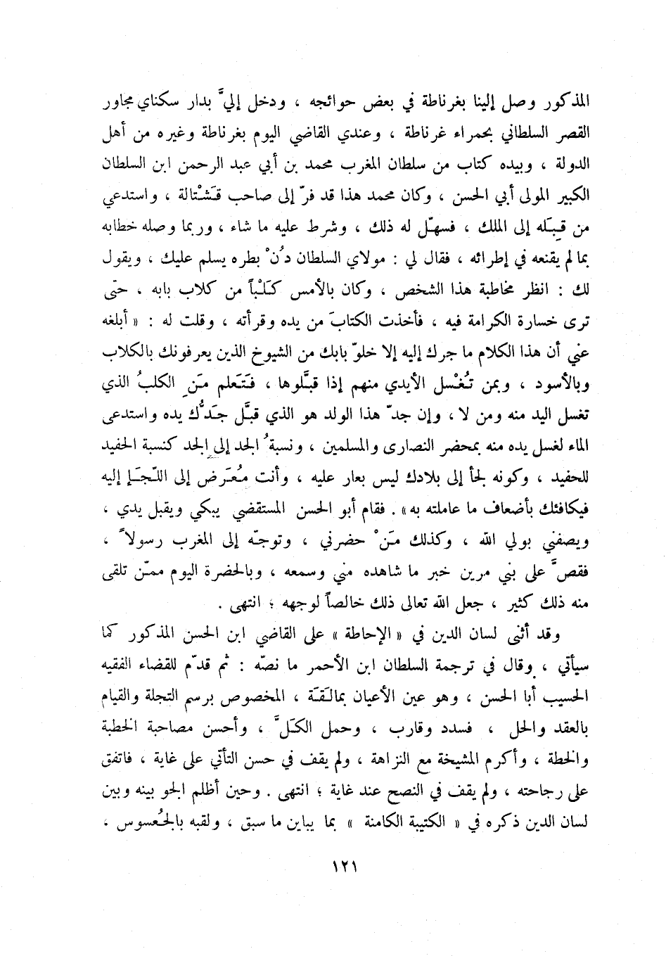 المذكور وصل إلينا بغرناطة في بعض حوائجه، ودخل إلي بدار سكناي مجاور القصر السلطاني بحمراء غرناطة، وعندي القاضي اليوم بغرناطة وغيره من أهل الدولة، وبيده كتاب من سلطان المغرب محمد بن أبي عبد الرحمن ابن السلطان الكبير المولى أبي الحسن، وكان محمد هذا قد فر إلى صاحب قشتالة، واستدعي من قبله إلى الملك، فسهل له ذلك، واشترط عليه ما شاء، وربما وصله خطابه بما لم يقنعه في إطراءه، فقال لي: مولاي السلطان دن بطره يسلم عليك، ويقول لك: انظر مخاطبة هذا الشخص، وكان بالأمس كلباً من كلاب بابه، حتى ترى خسارة الكرامة فيه، فأخذت الكتاب من يده وقرأته، وقلت له: أبلغه عني أن هذا الكلام ما جرك إليه إلا خلو بابك من الشيوخ الذين يعرفونك بالكلاب وبالأسود، وبمن تغسل الأيدي منهم إذا قبلوها، فتعلم من الكلب الذي تغسل اليد منه ومن لا، وإن جد هذا الولد هو الذي قبل جدك يده واستدعى الماء لغسل يده منه بمحضر النصارى والمسلمين، ونسبة الجد إلى الجد كنسبة الحفيد إلى الحفيد، وكونه لجأ إلى بلادك ليس بعار عليه، وأنت معرض إلى اللجإ إليه فيكافئك بأضعاف ما عاملته به.