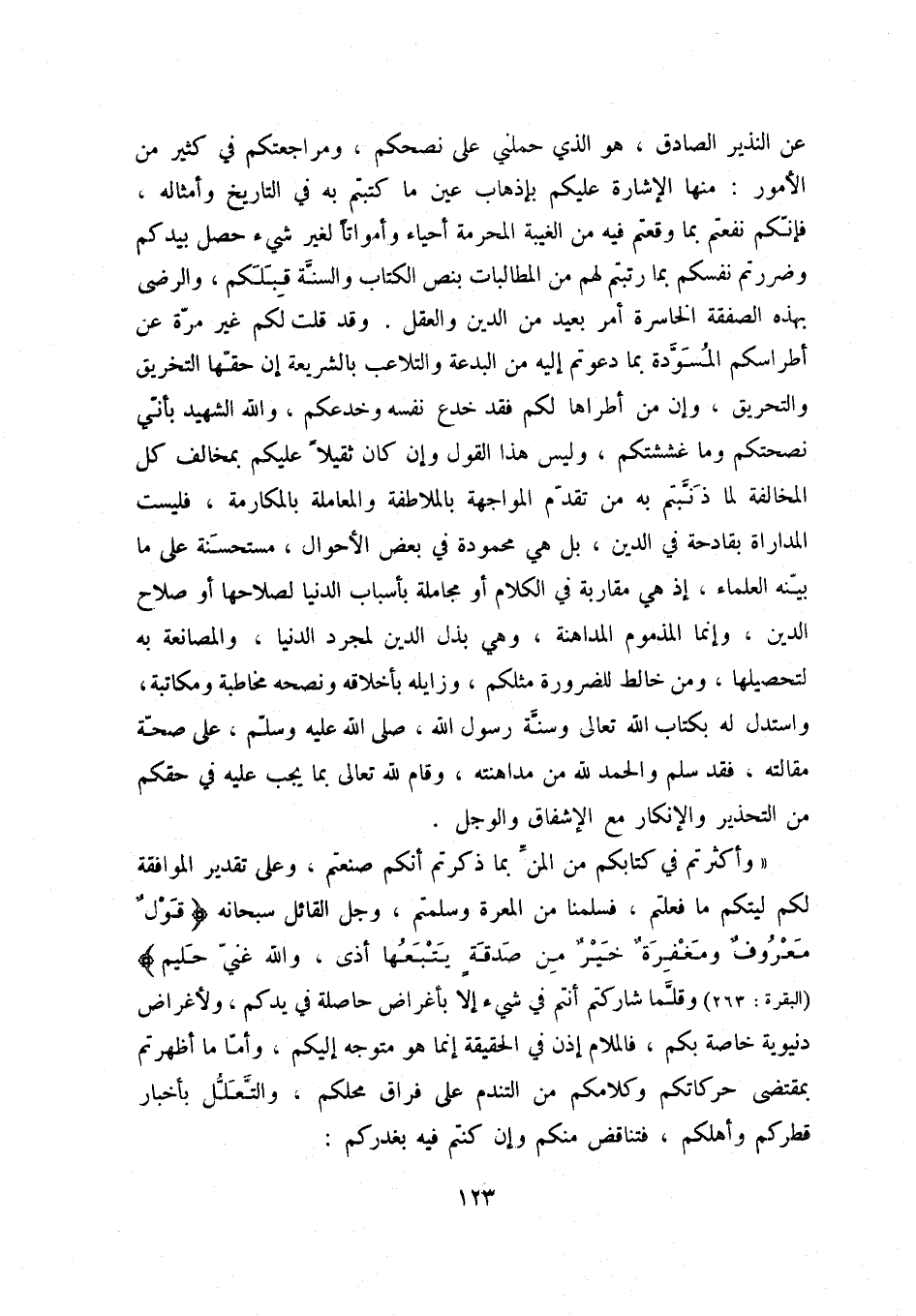 عن النذير الصادق، هو الذي حملني على نصحكم، ومراجعتكم في كثير من الأمور: منها الإشارة عليكم بإذهاب عين ما كتبتم به في التاريخ وأمثاله، فإنكم نفعتم فيما وقعتم فيه من الغيبة المحرمة أحياء وأموات بغير شيء حصل بيدكم وضررتم نفسكم بما رتبتم لهم من المطالبات بنص الكتاب والسنة قبلكم، والرضى بهذه الصفقة الخاسرة أمر بعيد من الدين والعقل. وقد قلت لكم غير مرة عن أطراسكم المسودة بما دعوتم إليه من البدعة والتلاعب بالشريعة إن حقها التخريق والتحريق، وإن من أطراها لكم فقد خدع نفسه وخدعكم، والله الشهيد بأني نصحتكم وما غششتكم، وليس هذا القول وإن كان ثقيلاً عليكم بمخالف كل المخالفة لما ذنبتم به من تقدم المواجهة بالملاطفة والمعاملة بالمكارمة، فليست المداراة بقادحة في الدين، بل هي محمودة في بعض الأحوال، مستحسنة على ما بينه العلماء، إذا هي مقاربة في الكلام أو مجاملة بأسباب الدنيا لصلاحها أو صلاح الدين، وإنما المذموم المداهنة، وهي بذل الدين لمجرد الدنيا، والمصانعة به لتحصيلها، ومن خالط للضرورة مثلكم، وزايله بأخلاقه ونصحه مخاطبة ومكاتبة، واستدل له بكتاب الله تعالى وسنة رسول الله صلى الله عليه وسلم، على صحة مقالته، فقد سلم والحمد لله من مداهنته، وقام لله تعالى بما يجب عليه في حقكم من التحذير والإنكار مع الإشفاق والوجل.