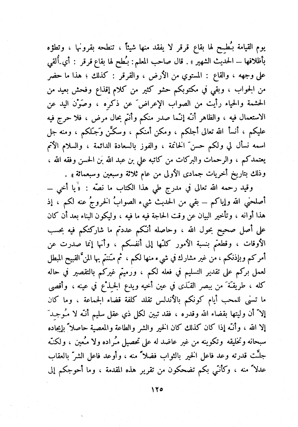 يوم القيامة بطح لها بقاع قرقر لا يفقد منها شيئاً، تنطحه بقرونها، وتطأه بأظلافها، الحديث الشهير. قال صاحب المعلم: بطح لها بقاع قرقر: أي ألقي على وجهه، والقاع: المستوي من الأرض، والقرقر: كذلك، هذا ما حضر من الجواب، وبقي في مكتوبكم حشو كثير من كلام إقذاع وفحش بعيد من الحشمة والحياء ورأيت من الصواب الإعراض عن ذكره، وصون اليد عن الاستعمال فيه، والظاهر أنه إنما صدر منكم وأنتم بحال مرض، فلا حرج فيه عليكم، أنسأ الله تعالى أجلكم، ومكن أمنكم، وسكن وجلكم، ومنه جل اسمه نسأل لي ولكم حسن الخاتمة، والفوز بالسعادة الدائمة، والسلام الأتم يعتمدكم، والرحمات والبركات من كاتبه علي بن عبد الله بن الحسن وفقه الله، وذلك بتاريخ أخريات جمادى الأولى من عام ثلاثة وسبعين وسبعمائة.