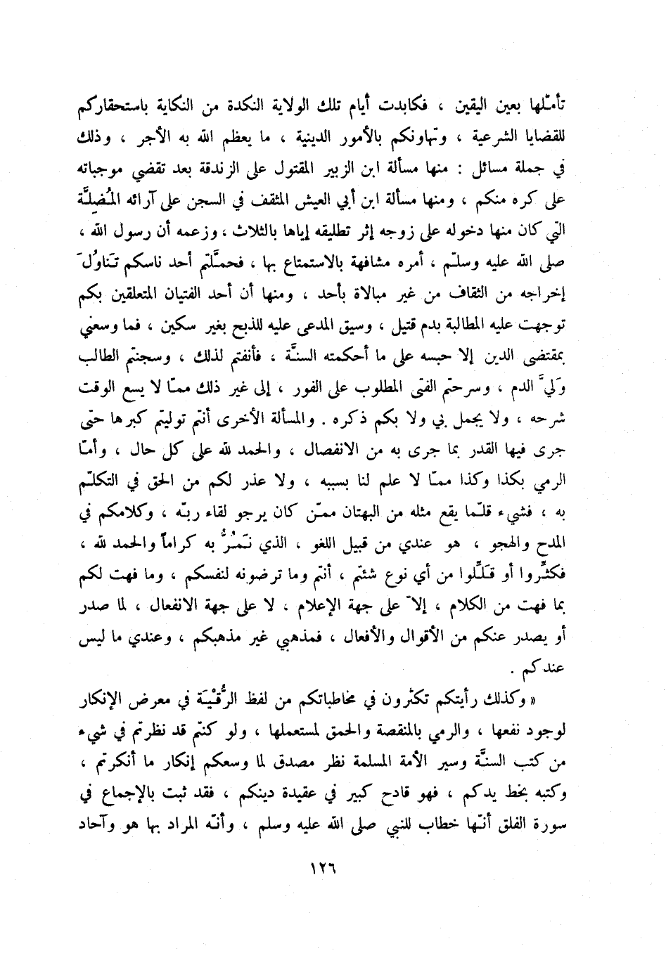 تأملها بعين اليقين، فكابدت أيام تلك الولاية النكدة من النكاية باستحقاركم للقضايا الشرعية، وتهاونكم بالأمور الدينية، ما يعظكم الله به الأجر، وذلك في جملة مسائل: منها مسألة ابن الزبير المقتول على الزندقة بعد تقضي موجباته على كره منكم، ومنها مسألة ابن أبي العيش المثقف في السجن على آراءه المضلة التي كان منها دخوله على زوجته إثر تطليقه إياها بالثلاث، وزعمه أن رسول الله صلى الله عليه وسلم، أمره مشافهة بالاستمتاع بها، فحملت أحد ناسكم تناول إخراجه من الثقاف من غير مبالاة بأحد، ومنها أن أحد الفتيان المتعلقين بكم توجهت عليه المطالبة بدم قتيل، وسيق المدعى عليه بالذبح بغير سكين، فما وسعني بمقتضى الدين إلا حبسه على ما أحمته السنة، فأنفتم لذلك، وسجنتم الطالب ولي الدم، ولا يجمل بي ولا بكم ذكره، والمسألة الأخرى أنتم توليتم كبرها حتى جرى فيها القدر بما جرى به من الانفصال، والحمد لله على كل حال، وأما الرمي بكذا وكذا مما لا علم لنا بسببه، ولا عذر لكم من الحق في التكلم به، فشيء قلما يقع مثله من البهيان ممن كان يرجو لقاء ربه، وكلامكم في المدح والهجو، هو عندي من قبيل اللغو، الذي نمر به كراماُ والحمد لله، فكثروا أو قللوا من أي نوع شئتم، أنتم وما ترضونه لنفسكم، وما فهت لكم بما فهت من الكلام، إلا على جهة الإعلام، لا على جهة الانفعال، لما صدر أو يصدر عنكم من الأقوال والأفعال، فمذهبي غير مذهبكم، وعندي غير ما ليس عندكم.