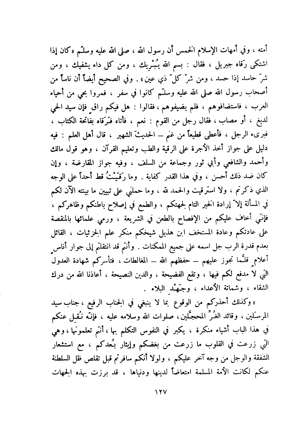 أمته، وفي أمهات الإسلام الخمس أن رسول الله، صلى الله عليه وسلم كان إذا اشتكى رقاه جبريل، فقال: بسم الله يبريك، ومن كل داء يشفيك، ومن شر حاسد إذا حسد، ومن شر كل ذي عين. وفي الصحيح أيضاً أن ناساً من أصحاب رسول الله صلى الله عليه وسلم كانوا في سفر، فمروا بحي من أحياء العرب، فاستضافوهم، فلم يضيفوهم، فقالوا: هل فيكم راق فإن سيد الحي لديغ، أو مصاب، فقال رجل من القوم: نعم، فأتاه فرقاه بفاتحة الكتاب، فبرئ الرجل، فأعطى قطيعاً من غنم - الحديث الشهير -. قال أهل العلم: فيه دليل على جواز أخذ الأجرة على الرقية والطب وتعليم القرآن، وهو قول مالك وأحمد والشافعي وأبي ثور وجماعة من السلف، وفيه جواز المقارضة، وإن كان ضد ذلك أحسن، وفي هذا القدر كفاية. وما رقيت قط أحداُ على الوجه الذي ذكرتم، ولا استرقيت والحمد لله، وما حملني على تبيين ما بينته الآن لكم في المسألة إلا إرادة الخير التام لجهتكم، والطمع في إصلاح باطنكم وظاهركم، فإني أخاف عليكم من الإفصاح بالطعن في الشريعة، ورمي علمائها بالمنقصة إلى عادتكم وعادة المستخف ابن هذيل شيخكم منكر علم الجزئيات، القائل بعدم قدرة الرب جل اسمه على جميع الممكنات. وأنتم قد انتقلتم إلى جوار أناس أعلام قلما تجوز عليهم - حفظهم الله - المغالطات، فتأسركم شهادة العدول التي لا مدفع لكم فيها، وتقع الفضيحة، والدين النصيحة، أعاذنا الله من درك الشقاء، وشماتة الأعداء، وجهد البلاء.
