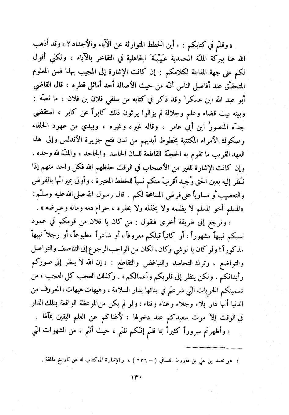 ونرجع إلى طريقة أخرى فنقول: من كان يا فلان من قومكم في عمود نسبكم نبيهاً مشهوراً، أو كاتباً قبلكم معروفاً، أو شاعراً مطبوعاً، أو رجلاً نبيها ُ مذكوراً ولو كان يا لوشي وكان، لكان من الواجب الرجوع إلى التناصف والتواصل والتواضع، وترك التحاسد والتباغض والتقاطع: " إن الله لا ينظر إلى صوركم وأبدانكم، ولكن ينظر إلى قلوبكم وأعمالكم ". وكذلك العجب كل العجب، من تسميتكم الخربات التي شرعتم في بنائها بدار السلامة، وهيهات هيهات، المعروف من الدنيا أنها دار بلاء وجلاء وعناء وفناء، ولو لم يكن من الموعظة الواقعة بتلك الدار في الوقت إلا موت سعيدكم عند دخولها، لأغناكم عن العلم اليقين بمآلها.