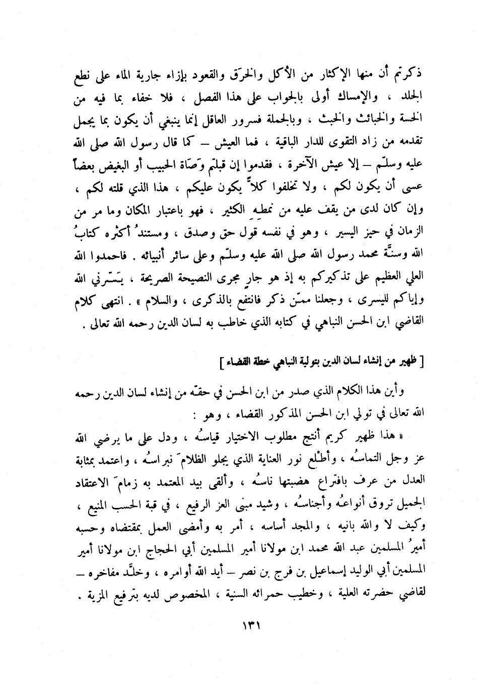 ذكرتم أن منها الإكثار من الأكل والخرق والقعود بإزاء جارية الماء على نطع الجلد، والإمساك أولى بالجواب على هذا الفصل، فلا خفاء بما فيه من الخسة والخبائث والخبث، وبالجملة فسرور العاقل إنما ينبغي أن يكون بما يجمل تقدمه من زاد التقوى بالدار الباقية، فما العيش - كما قال رسول الله صلى الله عليه وسلم - إلا عيش الآخرة، فقدموا إن قبلتم وصاة الحديد أو البغيض بعضاً عسى أن يكون لكم، ولا تخلفوا كلاُ يكون عليكم، هذا الذي قلته لكم، وإن كان لدى من يقف عليه من نمطه الكثير، فهو باعتبار المكان وما مر من الزمان في حيز اليسير، وهو في نفسه قول حق وصدق، ومستند أكثره كتاب الله وسنة محمد رسول الله صلى الله عليه وسلم وعلى سائر أنبيائه. فاحمدوا الله العلي العظيم على تذكيركم به إذ هو جار مجرى النصيحة الصريحة، يسرني الله وإياكم لليسرى، وجعلنا ممن ذكر فانتفع بالذكرى، والسلام. انتهى كلام القاضي ابن الحسن النباهي في كتابه الذي خاطب به لسان الدين رحمه الله تعالى.
