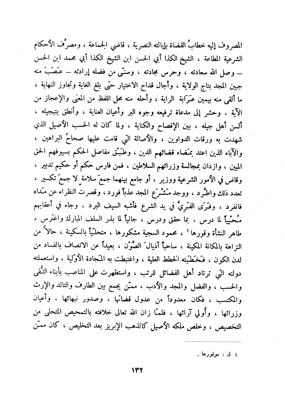 المصروف إليه خطاب القضاة بإيالته النصرية، قاضي الجماع، ومصرف الأحكام الشرعية المطاعة، الشيخ الكذا أبي الحسن ابن الشيخ كذا أبي محمد ابن الحسن - وصل الله سعادته، وحرس مجادته، وسنى بفضله إرادته - عصب منه جبين المجد بتاج الولاية، وأجال قداح الاختيار حتى بلغ الغاية وتجاوز النهاية، ما ألقى منه بيمين عرابة الراية، وأحله منه محل الفظ من المعنى والإعجاز من الآية، وحشر إلى مدعاة ترفيعه وجوه البر وأعيان العناية، وأنطق بتبجيله، ألسن أهل جيله، بين الإفصاح والكناية، ولما كان له الحسب الأصيل الذي شهدت به ورقات الدواوين، والأصالة التي قامت عليها صحاح البراهين، والآباء الذين اعتد بمضاء قضائهم الدين وطبق مفاصل الحكم بسيوفهم الحق المبين، وازدان بمجالسة وزرائهم السلاطين، فمن فارس حكم أو حكيم تدبير، وقاض في الأمور الشرعية ووزير، أو جامع بينهما جمع سلامة لا جمع تكسير، تعدد ذلك واطرد، ووجد مشرع المجد عذباً فورد، وقصرت النظراء عن مداه فانفرد، وفرى الفري في يد الشرع فأشبه السيف البرد، وجاء في أعقابهم محيياً لما درس، بما حقق ودرس، جانياً لما بذر السلف المبارك واغترس، طاهر النشأة وقورها، محمود السجية مشكورها، متحلياً بالسكينة، حالاً من لدن الكون، فخطبته الخطط العلية، واغتبطت به المجابة الأولية، واستعملته دولته التي ترتاد أهل الفضائل للرتب، واستظهرت على المناصب بأبناء التقى والحسب، والفضل والمجد والأدب، ممن يجمع بين الطارف والتالد والإرث والمكتسب، فكان معدوداً من عدول قضاتها، وصدور نبهائها، وأعيان وزرائها، وأولي آرائها، فلما زان الله تعالى خلافته بالتمحيص المتحلى من التخصيص، وخلص ملكه الأصيل كالذهب الإبريز بعد التخليص، كان ممن