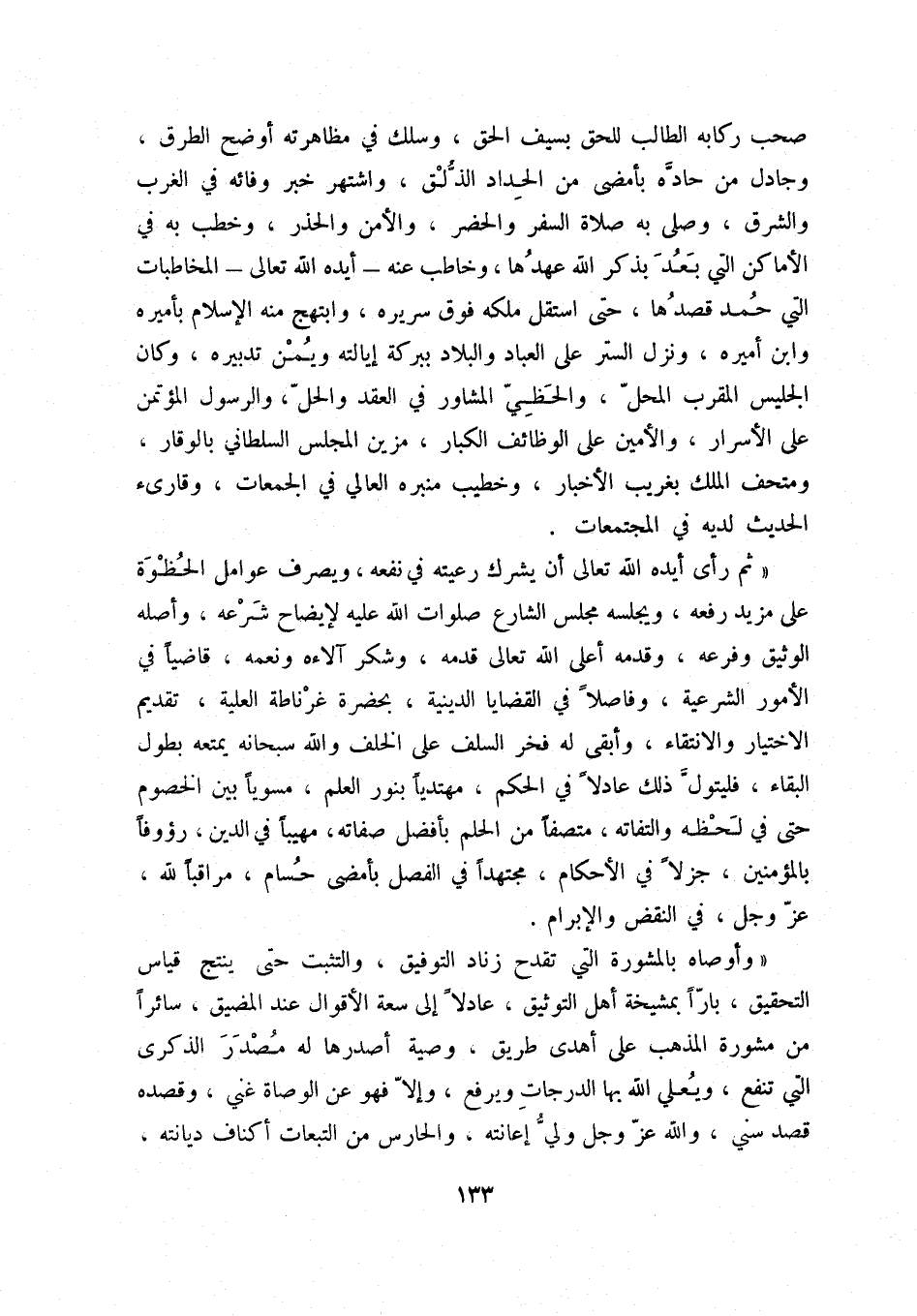 وأوصاه بالمشورة التي تقدح زناد التوفيق، والتثبت حتى ينتج قياس التحقيق، باراً بمشيخة أهل التوثيق، عادلاُ إلى سعة الأقوال عند المضيق، سائراً من مشورة المذهب على أهدى طريق، وصية أصدرها له مصدر الذكرى التي تنفع، ويعلي الله بها الدرجات ويرفع، وإلا فهو عن الوصاة غني، وقصده قصد سني، والله عز وجل ولي إعانته، والحارس من التبعات أكناف ديانته
