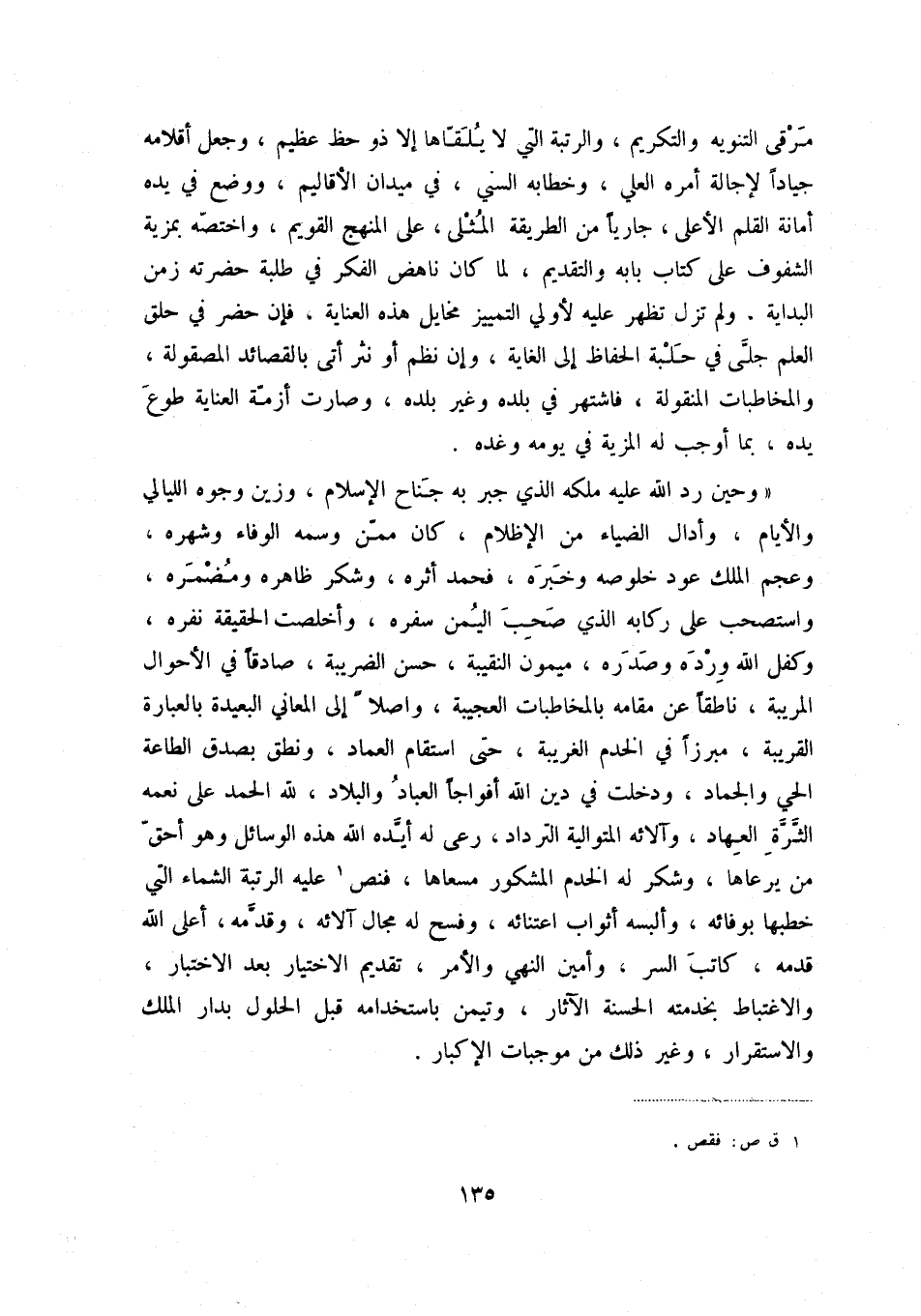 وحين رد الله عليه ملكه الذي جبر به جناح الإسلام، وزين وجوه الليالي والأيام، وأدال الضياء من الظلام، كان ممن وسمه الوفاء وشهره، وعجب الملك عود خلوصه وخبره، فحمد أثره، وشكر ظاهره ومضمره، واستصحب على ركابه الذي صحب اليمن سفره، وأخلصت الحقيقة نفره، وكفل الله ورده وصدره، ميمون النقيبة، حسن الضريبة، صادقاً في الأحوال المريبة، ناطقاً عن مقامه بالمخاطبات العجيبة، واصلاً إلى المعاني البعيدة العبارة القريبة، مبرزاً في الخدم الغريبة، حتى استقام العماد، ونطق بصدق الطاعة الحي والجماد، ودخلت في دين الله أفواج العباد والبلاد، لله الحمد على نعمه الثرة العهاد، وآلائه المتوالية الترداد، رعى له أيد الله هذه الوسائل وهو أحق من يرعاها، وشكر له الخدم المشكور مسعاها، فنص (1) عليه الرتبة الشماء التي خطبها بوفائه، وألبسه أثواب اعتناءه، وفسح له مجال آلائه، وقدمه، أعلى الله قدمه، كاتب السر، وأمين النهي والأمر، تقديم الاختيار بعد الاختبار، والاغتباط بخدمته الحسنة الآثار، وتيمن باستخدامه قبل الحلول بدار الملك والاستقرار، وغير ذلك من موجبات الإكبار.