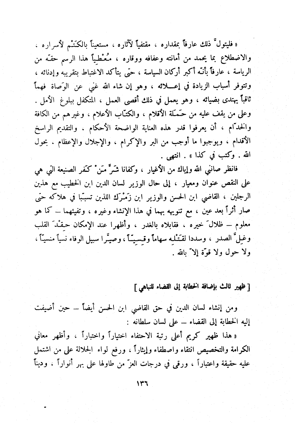ومن إنشاء لسان الدين في حق القاضي ابن الحسن أيضاً - حين أضيفت إليه الخطابة إلى القضاء - على لسان سلطانه: