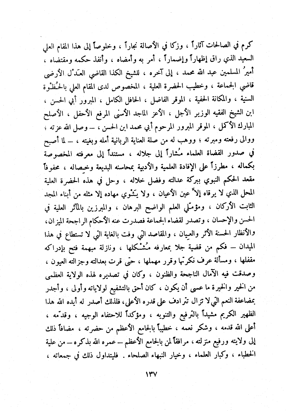 كرم في الصالحات آثاراً، وزكا في الأصالة نجاراً، وخلوصاً إلى هذا المقام العلي السعيد الذي راق إظهاراً وإضماراً، أمر به وأمضاه، وأنفذ حكمه ومقتضاه، أمير المسلمين عبد الله محمد، إلى آخره، للشيخ الكذا القاضي العدل الأرضى قاضي الجماعة، وخطيب الحضرة العلية، المخصوص لدى المقام العلي بالحظوة السنية، والمكانة الحفية، الموقر الفاضل، الحافل الكامل، المبرور أبي الحسن ابن الشيخ الفقيه الوزير الأجل، الأعز الماجد الأسنى المرفع الأحفل، الأصلح المبارك الأكمل، الموقر المبرور المرحوم أبي محمد ابن الحسن، - وصل الله عزته، ووالى رفعته ومبرته، ووهب له من صلة العناية الرانية أمله وبغيته، - لما أصبح في صدور القضاة العلماء مشاراً إلى جلاله، مستنداً إلى معرفته المخصوصة بكماله، مطرزاً على الإفادة العلمية والأدبية بمحاسنه البديعة وخصاله، محفوفاً مقعد الحكم النبوي ببركة عدالته وفضل خلاله، وحل في هذه الحضرة العلية المحل الذي لا يرقاه إلا عين الأعيان، ولا يثوي مهاده إلا مثله من أبناء المجد الثابت الأركان، ومؤملي العلم الواضح، والمبرزين بالمآثر العلية في الحسن والإحسان، وتصر لقضاة الجماعة فصدرت عنه الأحكام الراجحة الميزان، والأنظار الحسنة الأثر والعيان، والمقاصد التي وفت بالغاية التي لا تستطاع في هذا الميدان - فكم من قضية جلا بمعارفه مشكلها، ونازلة مبهمة فتح بإدراكه مقفلها، ومسألة عرف نكرتها وقرر مهملها، حتى قرت بعدالته وجزالته العيون، وصدقت فيه الآمال الناجحة والظنون، وكان في تصديره لهذه الولاية العظمى من الخير والخيرة ما عسى أن يكون، كان أحق بالتشفيع لولايته الأولى، وأجدر بمضاعفة النعم التي لا تزال تترادف على قدره الأعلى، فلذلك أصدر له أيده الله هذا الظهير الكريم مشيداً بالترفيع والتنويه، ومؤكداً للاحتفاء الوجيه، وقدمه، أعلى الله قدمه، وشكر نعمه، خطيباً بالجامع الأعظم من حضرته، مضافاُ ذلك إلى ولايته ورفيع منزلته، مرافقاً لمن في الجامع الأعظم - عمره الله بذكره - من علية الخطباء، وكبار العلماء، وخيار النبهاء الصلحاء، فليتداول ذلك في جماعته