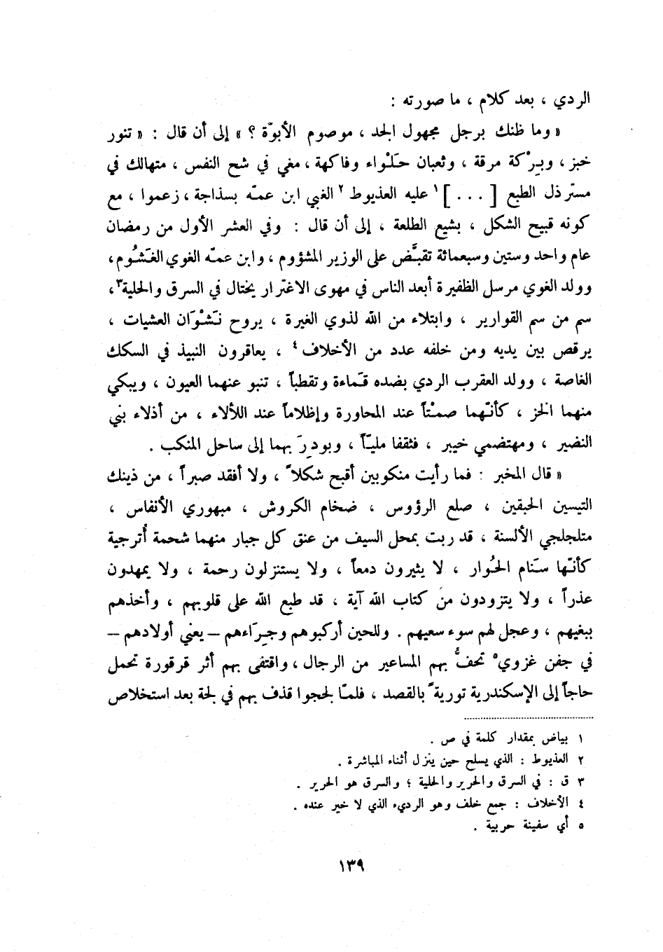 قال المخبر: فما رأيت منكوبين أقبح شكلاُ، ولا أفقد صبراُ، من ذينك التيسين الحبقين، صلع الرؤوس، ضخام الكروش، مبهوري الأنفاس، متلجلجي الألسنة، قد ربت بمحل السيف من عنق كل جبار منهما شحمة أترجية كأنها سنام الحوار، لا يثيرون دمعاً، ولا يستنزلون رحمة، ولا يمهدون عذراً، ولا يتزودون من كتاب الله آية، قد طبع الله على قلوبهم، وأخذهم ببغيهم، وعجل لهم سوء سعيهم. وللحين أركبوهم وجراءهم - يعني أولادهم - في جفن غزوي (5) تحف بهم المساعير من الرجال، واقتفى بهم أثر قرقورة تحمل حاجاً إلى الإسكندرية تورية بالقصد، فلما لججوا قذف بهم في لجة بعد استخلاص