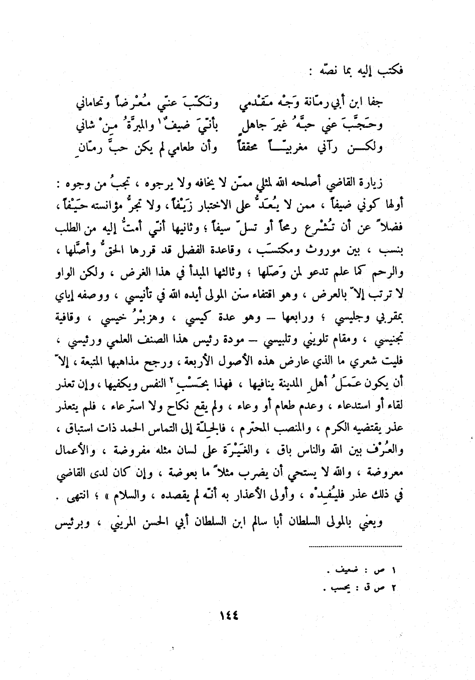 ولكن رآني مغربياً محققاً ... وأن طعامي لم يكن حب رمان زيارة القاضي أصلحه الله لمثلي ممن لا يخافه ولا يرجوه، تجب من وجوه: أولها كوني ضيفاً، ممن لا يعد على الاختبار زيفاً، ولا تجر مؤانسته حيفاً، فضلاً عن أن تشرع رمحاً أو تسل سيفاً؛ وثانيها أني أمت إليه من الطلب بنسب، بين موروث ومكتسب، وقاعدة الفضل قد قررها الحق وأصلها، والرحم كما علم تدعو لمن وصلها؛ وثالثها المبدأ في هذا الغرض، ولكن الواو لا ترتب إلا بالعض، وهو اقتفاء سنن المولى أيده الله في تأنيسي، ووصفه إياي بمقربي وجليسي؛ ورابعها - وهو عدة كيسي، وهزبر خيسي، وقافية تجنيسي، ومقام تلويني وتلبيسي - مودة رئيس هذا الصنف العلمس ورئيسي، فليت شعري ما الذي عارض هذه الأصول الأربعة، ورجح مذاهبها المتبعة، إلا أن يكون عمل أهل المدينة ينافيها، فهذا بحسب (2) النفس ويكفيها، وإن تعذر لقاء أو استدعاء، وعدم طعام أو وعاء، ولم يقع نكاح ولا استرعاء، فلم يتعذر عذر يقتضيه الكرم، والمنصب المحترم، فالجلة إلى التماس الحمد ذات استباق، والعرف بين الله والناس باق، والغيرة على لسان مثله مفروضة، والأعمال معروضة، والله لا يستحي أن يضرب مثلاً ما بعوضة، وإن كان لدى القاضي في ذلك عذراً فليفده، وأولى الأعذار به أنه لم يقصده، والسلام "؛ انتهى.