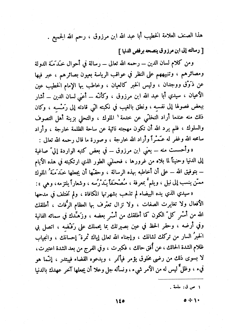 " وأحسست منه - يعني ابن مرزوق - في بعض كتبه الواردة إلي إلى الدنيا وحنيناً لما بلاه من غرورها، فحملني الطور الذي ارتكبته في هذه الأيام - بتوفيق الله - على أن أخاطبه بهذه الرسالة، وحقها أن يجعلها خدمة الملوك ممن ينسب إلى نبل، ويلم بمعرفة، مصحفاً يدرسه، وشعاراً يلتزمه، وهي: سيدي الذي يده البيضاء لم تذهب بشهرتها المكافأة، ولم تختلف في مدحها الأفعال ولا تغايرت الصفات، ولا تزال تعترف بها العظام الرفات، أطلقك الله من أسر كل الكون كما أطلقك من أسلا بعضه، وزهدك في سمائه الفانية وفي أرضه، وحقر الحظ في عين بصيرتك بما يحملك على رفضه، اتصل بي الخبر السار من تركك لشانك، وإجناء الله تعالى إياك ثمرة إحسانك، وانجياب ظلام الشدة الحالك، عن أفق حالك، فكبرت، وفي الفرج من بعد الشدة اعتبرت، لا بسوى ذلك من رضى مخلوق يؤمر فيأتمر، ويدعوه القضاء فيبتدر، إنما هو فيء، وظل ليس له من الأمر شيء، ونسأله جل وعلا أن يجعلها آخر عهدك بالدنيا