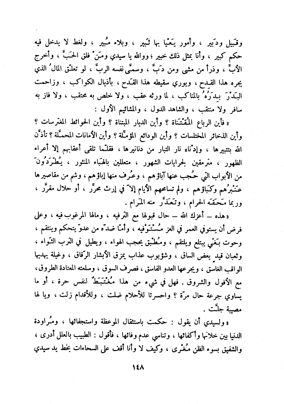 " هذه - أعزك الله - حال قبولها مع الترفيه، ومالها المرغوب فيه، وعلى فرض أن يستوفي العمر في العز مستوفيه، وأما ضده من عدو يتحكم وينتقم، وحوت بغي يبتلع ويلتقم، ومطبق يحجب الهواء، ويطيل في التراب الثواء، وثعبان قيد يعض الساق، وشؤبوب عذاب يمزق الأبشار الرقاق، وغيلة يهديها الواقب الغاسق، ويجرعها العدو الفاسق، فصرف السوق، وسلعته المعتادة الطروق، مع الأفول والشروق. فهل في شيء من هذا مغتبط لنفس حرة، أو ما يساوي جرعة حال مرة واحسرتا للأحلام ضلت، وللأقدام زلت، ويا لها مصيبة جلت.