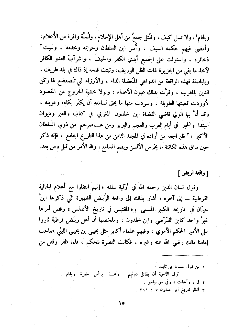 وقول لسان الدين رحمه الله في أولية سلفه إنهم انتقلوا مع أعلام الجالية القرطبية - إلى آخره، أشار بذلك إلى واقعة الربض الشهيرة التي ذكرها ابن حيان في تاريخه الكبير المسمى بالمقتبس في تاريخ الأندلس وقص أمرها غير واحد كابن الفرضي وابن خلدون، وملخصها أن أهل ربض قرطبة ثاروا على الأمير الحكم الأموي، وفيهم علماء أكابر مثل يحيى بن يحيى الليثي صاحب إمامنا مالك رضي الله عنه وغيره، فكانت النصرة للحكم، فلما ظفر وقتل من