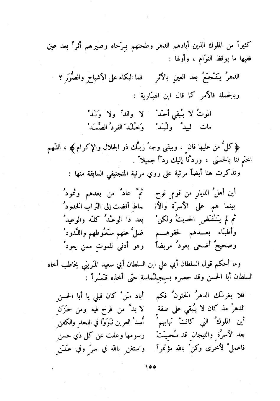 وصحيح أضحى يعود مريضاً ... وهو أدنى للموت ممن يعود وما أحكم قول السلطان أبي علي ابن السلطان أبي سعيد المريني يخاطب أخاه السلطان أبا الحسن وقد حصره بسجلماسة حتى أخذه قسراً: