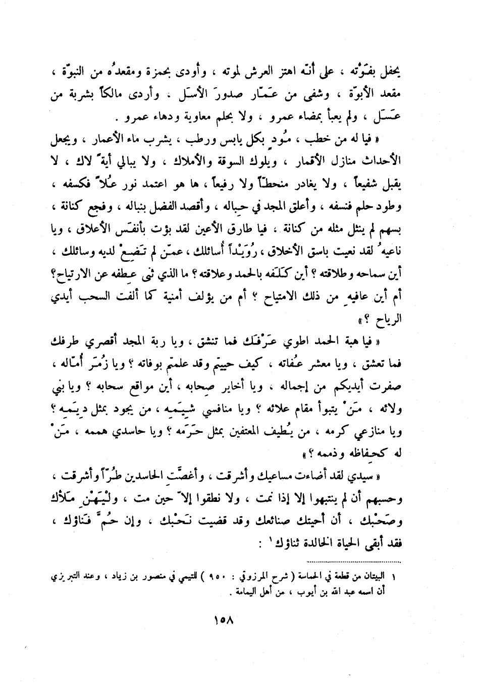 " فياله من خطب، مود بكل يابس ورطب، يشرب ماء الأعمار، ويجعل الأحداث منازل الأقمار، ويلوك السوقة والأملاك، ولا يبالي أية لاك، لا يقبل شفيعاً، ولا يغادر منحطاً ولا رفيعاً، ها هو اعتمد نور علاً فكسفه، وطود حلم فنفسه، وأعلق المجد في حباله، وأقصد الفضل بنباله، وفجع كنانة، بسهم لم ينثل مثله من كنانة، فيا طارق الأعين لقد بؤت بأنفس الأعلاق، ويا ناعيه لقد نعيت باسق الأخلاق، رويداً أسائلك، عمن لم تضع لديه وسائلك، أين سماحه وطلاقته أين كلفه بالحمد وعلاقته ما الذي ثنى عطفه عن الارتياح أم أين عافيه من ذلك الامتياح أو من يؤلف أمنية كما ألفت السحب أيدي الرياح