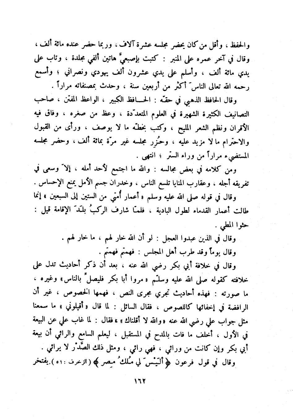 وقال في خلافة أبي بكر رضي الله عنه، بعد أن ذكر أحاديث تدل على خلافته كقوله صلى الله عليه وسلم " مروا أبا بكر فليصل بالناس " وغيره، ما صورته: فهذه أحاديث تجري مجرى النص، فهمها الخصوص، غير أن الرافضة في إخفائها كاللصوص، فقال السائل: لما قال: " أقيلوني " ما سمعنا مثل جواب علي رضي الله عنه " والله لا أقلناك "، فقال: لما غاب علي عن البيعة في الأول، أخلف ما فات بالمدح في المستقبل، ليعلم السامع والرائي أن بيعة أبي بكر وإن كانت من ورائي، فهي رائي، ومثل ذلك الصدر لا يرائي.