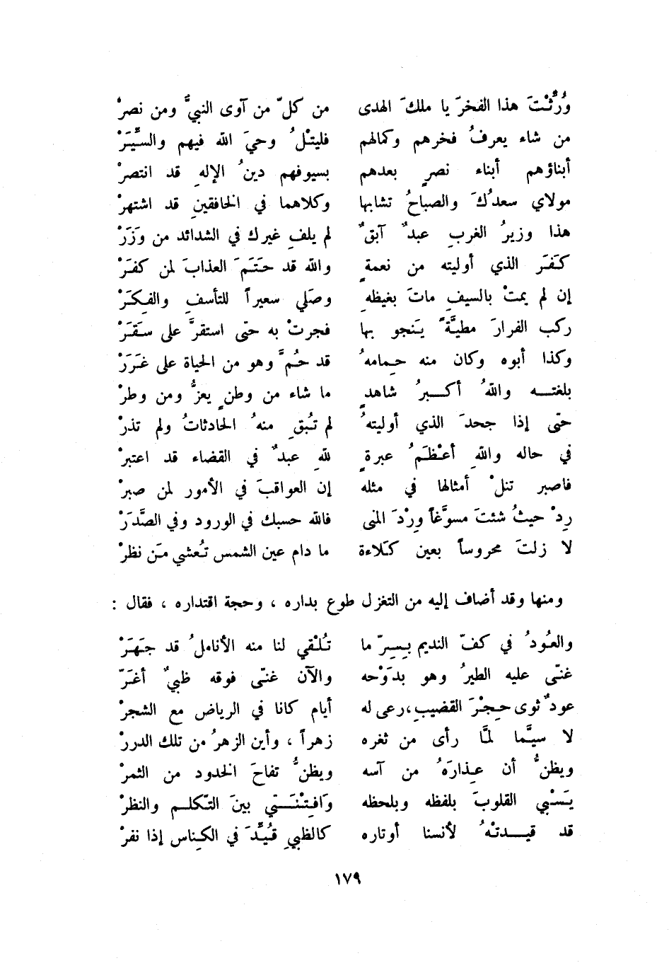 لا زلت محروساً بعين كلاءة ... ما دام عين الشمس تعشي من نظر ومنها وقد أضاف إليه من التغزل طوع بداره، وحجة اقتداره، فقال: