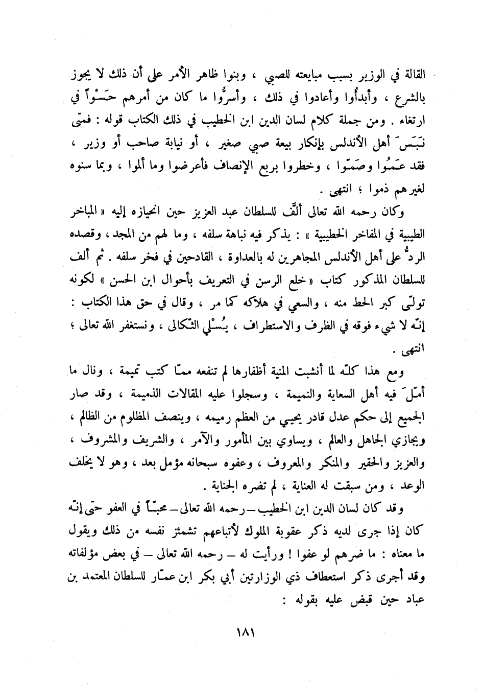 القالة في الوزير بسبب مبايعته للصبي، وبنوا ظاهر الأمر على أن ذلك لا يجوز بالشرع، وأبدأوا وأعادوا في ذلك، واسروا ما كان من أمرهم حسواً في ارتغاء. ومن جملة كلام لسان الدين ابن الخطيب في ذلك الكتاب قوله: فمتى نبس أهل الأندلس بإنكار بيعة صبي صغير، أو نيابة صاحب أو وزير، فقد عموا وصموا، وخطروا بربع الإنصاف فأعرضوا وما ألموا، وبما نسوه لغيرهم ذموا؛ انتهى.