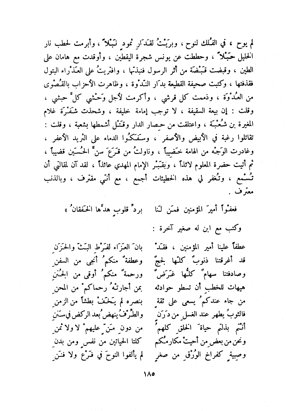 لم يوح، في الفلك لنوح، وبريت لقدار ثمود نبلاً، وأبرمت لحطب نار الخليل حبلاً، وحططت عن يونس شجرة اليقطين، وأوقدت مع هامان على الطين، وقبضت قبضة من أثر الرسول فنبذتها، وافتريت على العذراء البتول فقذفتها، وكتبت صحيفة القطيعة بدار الندوة، وظاهرت الأحزاب بالقصوى من العدوة، وذممت كل قرشي، وأكرمت لأجل وحشي كل حبشي، وقلت: إن بيعة السقيفة، لا توجب إمامة خليفة، وشحذت شفرة غلام المغيرة بن شعبة، واعتقلت من حصار الدار وقتل اشمطها بشعبة، وقلت: تقاتلوا رغبة في الأبيض والأصفر، وسفكوا الدماء على الثريد الأعفر، وغادرت الوجه من الهامة خضيباً، وناولت من قرع سن الحسين قضيباً، ثم أتيت حضرة المعلوم لائذاً، وبقبر الإمام المهدي عائذاً، لقد آن لمقالتي أن تسمع، وتغفر لي هذه الخطيئات أجمع، مع أني مقترف، وبالذنب معترف.