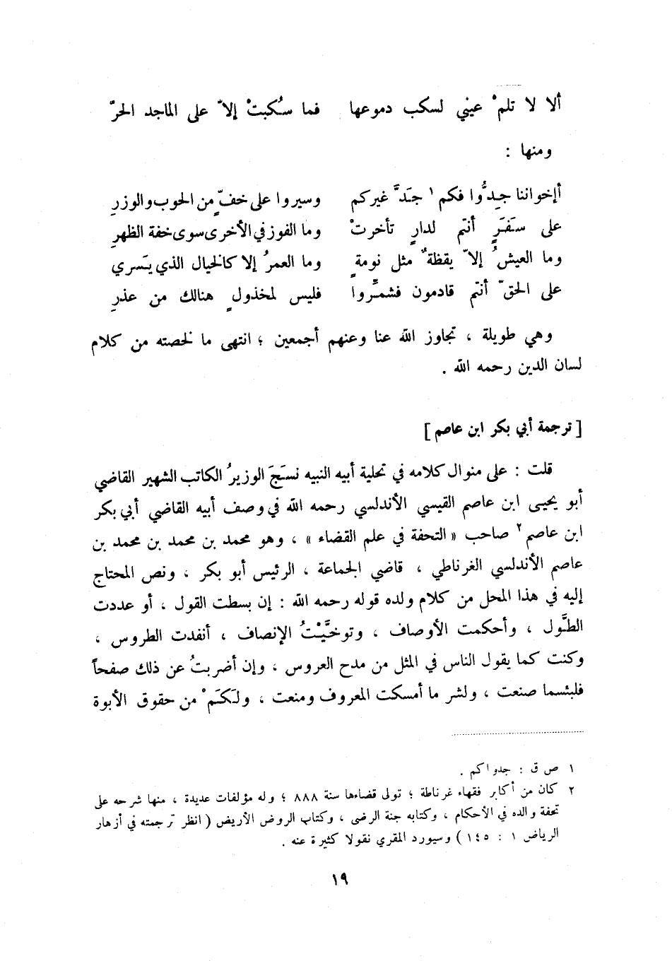 قلت: على منوال كلامه في تحلية أبيه النبيه نسج الوزير الكاتب الشهير القاضي أبو يحيى ابن عاصم القيسي الأندلسي رحمه الله في وصف أبيه القاضي أبي بكر ابن عاصم (2) صاحب التحفة في علم القضاء، وهو محمد بن محمد بن محمد بن عاصم الأندلسي الغرناطي، قاضي الجماعة، الرئيس أبو بكر، ونص المحتاج إليه في هذا المحل من كلام ولده قوله رحمه الله: إن بسطت القول، أو عددت الطول، وأحكمت الأوصاف، وتوخيت الإنصاف، أنفدت الطروس، وكنت كما يقول الناس في المثل من مدح العروس، وإن أضربت عن ذلك صفحاً فلبئسما صنعت، ولشر ما أمسكت المعروف ومنعت، ولكم من حقوق الأبوة