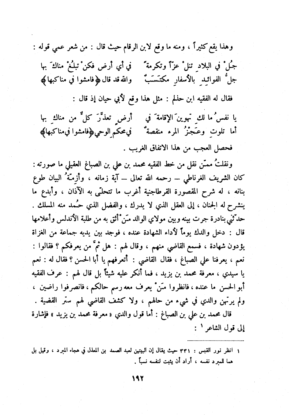 جل الفوائد بالأسفار مكتسب ... والله قد قال " فامشوا في مناكبها " فقال له الفقيه ابن حذلم: مثل هذا وقع لأبي حيان إذ قال: