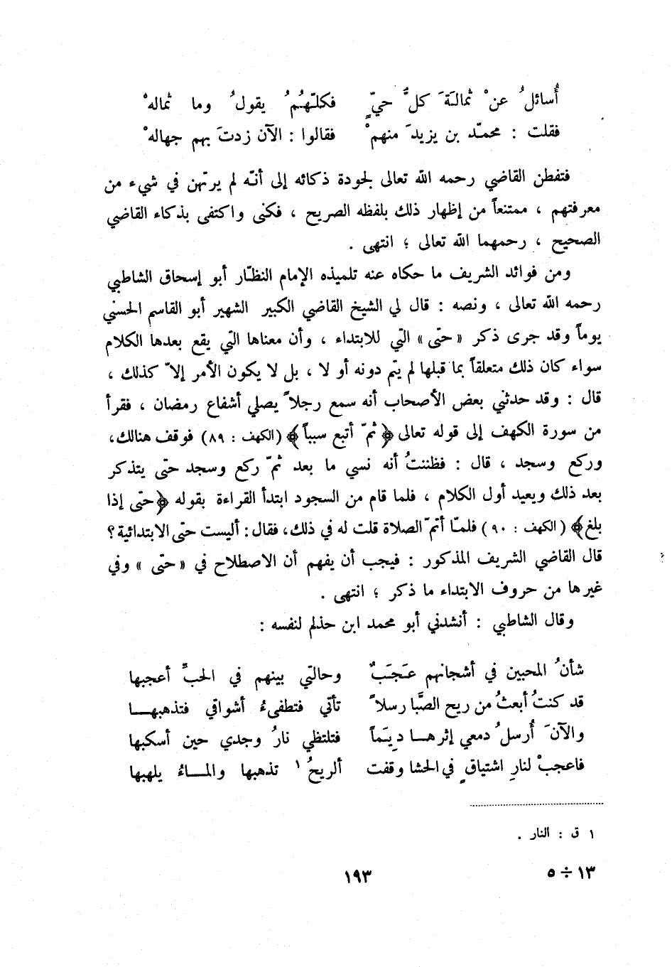 فقلت: محمد بن يزيد منهم ... فقالوا: الآن زدت بهم جهالة فتفطن القاضي رحمه الله تعالى لجودة ذكائه إلى أنه لم يرتهن في شيء من معرفتهم، ممتنعاً من إظهار ذلك بلفظه الصريح، فكنى واكتفى بذكاء القاضي الصحيح، رحمهما الله تعالى؛ انتهى. ومن فوائد الشريف ما حكاه عنه تلميذه الإمام النظار أبو إسحاق الشاطبي رحمه الله تعالى، ونصه: قال لي الشيخ القاضي الكبير أبو القاسم الحسني يوماً وقد جرى ذكر حتى التي للابتداء، وأن معناها التي يقع بعدها الكلام سواء كان ذلك متعلقاً بما قبلها لم يتم دونه أو لا، بل لا يكون الأمر إلا كذلك، قال: وقد حدثني بعض الأصحاب أنه سمع رجلاً يصلي أشفاع رمضان، فقرأ من سورة الكهف إلى قوله تعالى " ثم أتبع سبباً " فوقف هنالك، وركع وسجد، قال: فظننت أنه نسي ما بعد ثم ركع وسجد حتى يتذكر بعد ذلك ويعيد أول الكلام، فلما قام من السجود ابتدأ القراءة بقوله " حتى إذا بلغ " فلما أتم الصلاة قلت له في ذلك، فقال: أليست حتى الابتدائية قال القاضي الشريف المذكور: فيجب أن يفهم أن الاصطلاح في حتى وفي غيرها من حروف الابتداء ما ذكر؛ انتهى. وقال الشاطبي: أنشدني أبو محمد ابن حذلم لنفسه: