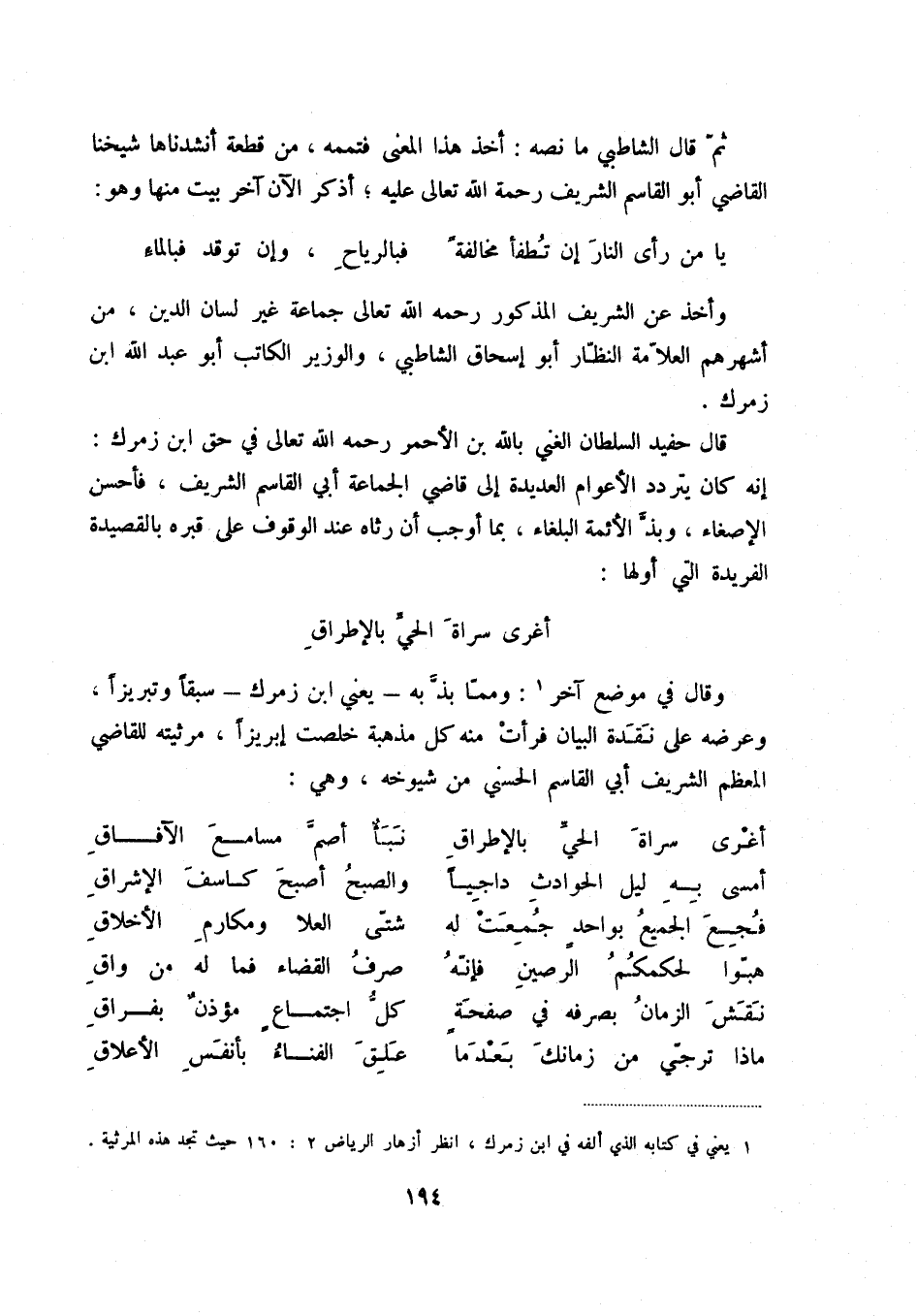 أغرى سراة الحي بالإطراق ... وقال في موضع آخر (1) : ومما بذ به - يعني ابن زمرك - سبقاً وتبريزاً، وعرضه على نقدة البيان فرأت منه كل مذهبة خلصت إبريزاً، مرثيته للقاضي المعظم الشريف أبي القاسم الحسني من شيوخه، وهي: