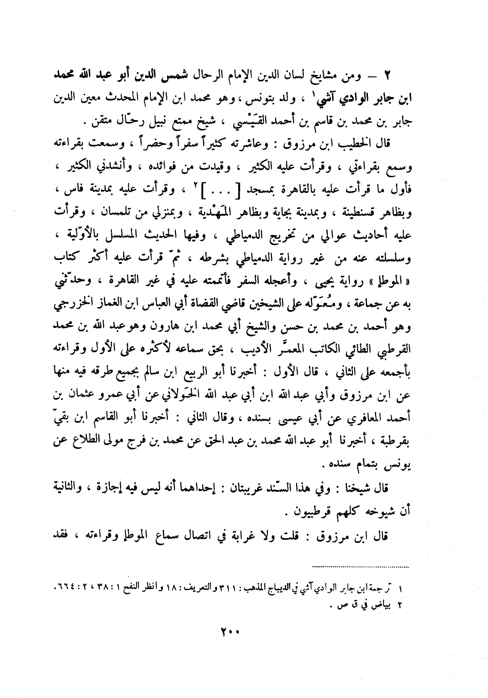 2 - ومن مشايخ لسان الدين الإمام الرحال شمس الدين أبو عبد الله محمد ابن جابر الوادي آشي (1) ، ولد بتونس، وهو محمد بن الإمام المحدث معين الدين جابر بن محمد بن قاسم بن أحمد القيسي، شيخ ممتع رحال متقن.