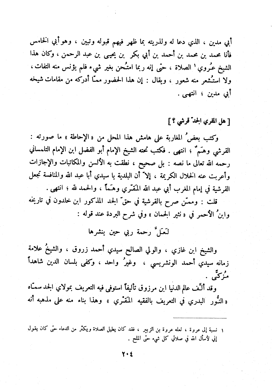 قلت: وممن صرح بالقرشية في حق الجد المذكور ابن خلدون في تاريخه وابن الأحمر في " نثير الجمان " وفي شرح البردة عند قوله:
