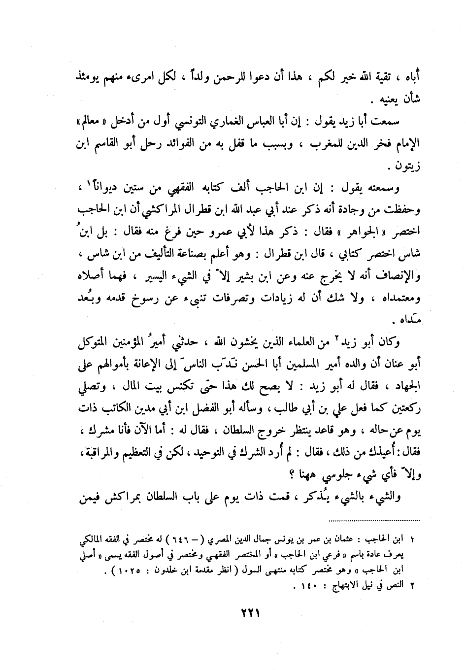 (1) ابن الحاجب: عثمان بن عمر بن يونس جمال الدين المصري (- 646) له مختصر في الفقه المالكي يعرف عادة باسم " فرعي ابن الجاجب " أو المختصر الفقهي ومختصر في أقول الفقه يسمى " أصلي ابن الحاجب " وهو مختصر كتابه منتهى السول (انظر مقدمة ابن خلدون: 1025) .