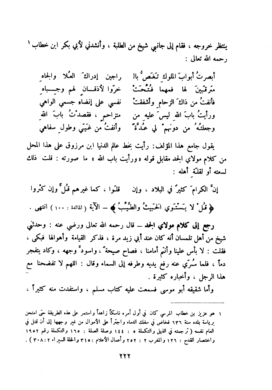 (1) هو عزيز خطاب المرسي كان أول أمره ناسكا زاهدا واستمر على هذه الطريقة حتى امتحن برياسة بلده سنة 636 فخاض في سفك الدماء واجترأ على الأموال من غير وجهها إلى أن قتل في العام نفسه (ترجمته في الذيل والتكملة 5: 144 وصلة الصلة: 165 والتكملة رقم 1952 واختصار القدح: 126 والمغرب 2: 252 وأعمال الأعلام: 315 والحلة السيراء 2: 308) .