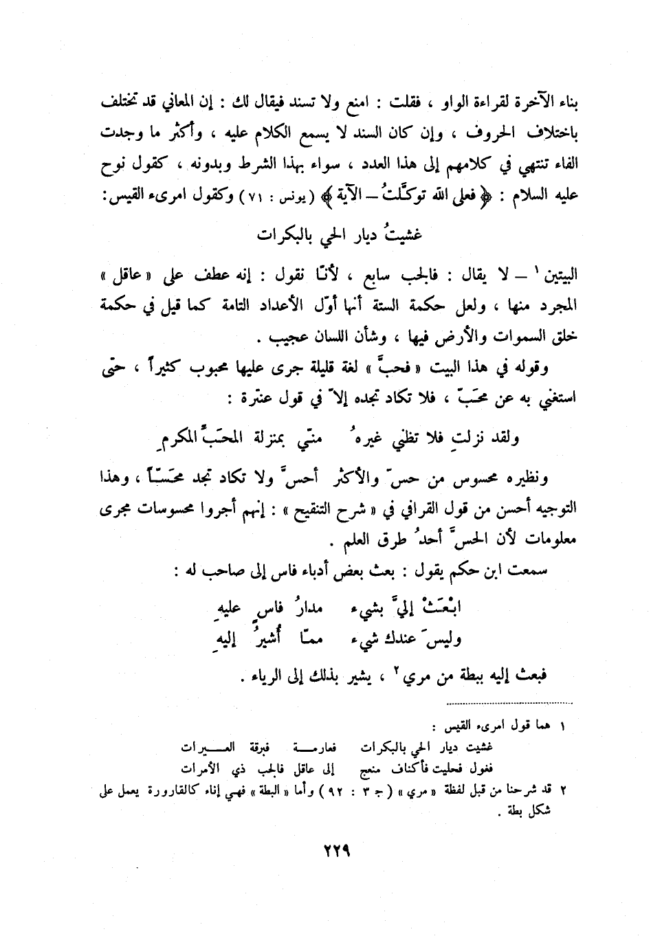 ولقد نزلت فلا تظني غيره ... مني بمنزلة المحب المكرم ونظيره محسوس من حس والأكثر أحس ولا تكاد تجد محساً، وهذا التوجيه أحسن من قول القرافي في " شرح التنقيح ": إنهم أجروا محسوسات مجرى معلومات لأن الحس أحد طرق العلم.