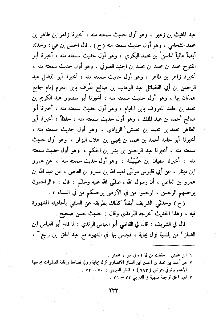 عبد المغيث بن زهير، وهو أول حديث سمعته منه، أخبرنا زاهر بن طاهر بن محمد الشحامي، وهو أول حديث سمعته منه. قال الحسن بن علي: وحدثنا أيضاً عالياً الحسن بن محمد البكري، وهو أول حديث سمعته منه، أخبرنا ابن الفتوح محمد بن محمد بن محمد بن الجنيد الصوفي، وهو أول حديث سمعته منه، أخبرنا زاهر بن طاهر، وهو أول حديث سمعته منه، أخبرنا أبو الفضل عبد الرحمن بن أبي الفضائل عبد الوهاب بن صالح عرف بابن المغرم إمام جامع همذان بها، وهو أول حديث سمعته منه، أخبرنا أبو منصور عبد الكريم بن محمد بن حامد المعروف بابن الخيام، وهو أول حديث سمعته عنه، أخبرنا أبو صالح أحمد بن عبد الملك، وهو أول حديث سمعته عنه، حفظاً، أخبرنا أبو الطاهر محمد بن محمد بن مخمش (1) الزيادي، وهو أول حديث سمعته عنه، أخبرنا أبو حامد أحمد بن محمد بن يحيى بن هلال البزاز، وهو أول حديث سمعته عنه، أخبرنا عبد الرحمن بن البشر بن الحكم، وهو أول حديث سمعته عنه، أخبرنا أبو سفيان بن عيينة، وهو أول حديث سمعته عنه، عن عمرو ابن دينار، عن أبي قاموس مولى لعبد الله بن عمرو بن العاص، عن عبد الله بن عمرو بن العاص، أن رسول الله، صلى الله عليه وسلم، قال: " الراحمون يرحمهم الرحمن، ارحموا من في الأرض يرحمكم من في السماء ".