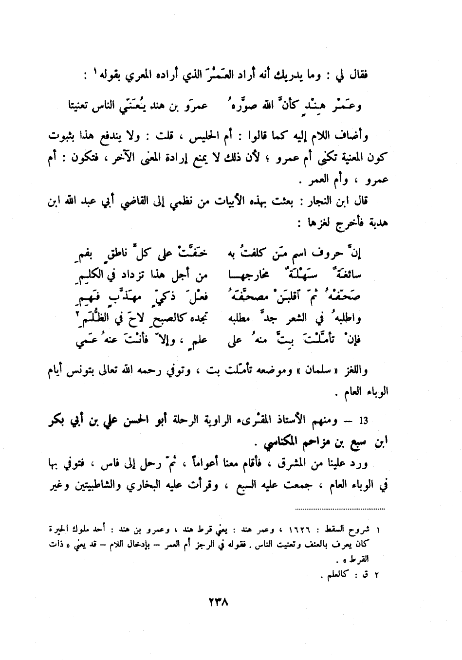 وعمر هند كأن الله صوره ... عمرو ابن هند يعني الناس تعنيتا وأضاف اللام إليه كما قالوا: أم الحليس، قلت: ولا يندفع هذا بثبوت كون المعنية تكنى أم عمرو؛ لأن ذلك لا يمنع إرادة المعنى الآخر، فتكون: أم عمرو وأم العمر.