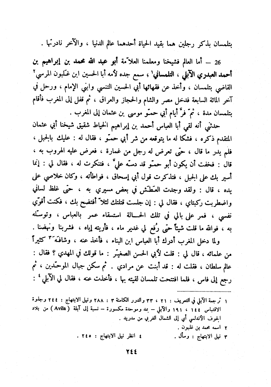 26 - أما العالم فشيخنا ومعلمنا العلامة أبو عبد الله بن محمد بن إبراهيم بن أحمد العبدري الآبلي، التلمساني (1) ، سمع جده لأمه أبا الحسين ابن غلبون المرسي (2) القاضي بتلمسان، وأخذ عن فقهائها أبي الحسين التنسي وابني الإمام، ورحل في آخر المائة السابعة فدخل مصر والشام والحجاز والعراق، ثم قفل إلى المغرب فأقام بتلمسان مدة، ثم فر أيام أبي حمو موسى بن عثمان إلى المغرب.
