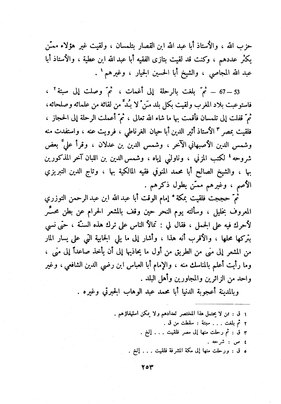 ثم حججت فلقيت بمكة (5) إمام الوقت أبا عبد الله ابن عبد الرحمن التوزري المعروف بخليل، وسألته يوم النحر حين وقف بالمشعر الحرام عن بطن محسر لأحرك فيه على الجمل، فقال لي: تمالأ الناس على ترك هذه السنة، حتى نسي بتركها محلها، والأقرب أنه هذا، وأشار إلى ما يلي الجابية التي على يسار المار من المشعر إلى منى من الطريق من أول ما يحاذيها إلى أن يأخذ صاعداً إلى منى، وما رأيت أعلم بالمناسك منه، والإمام أبا العباس ابن رضي الدين الشافعي، وغير واحد من الزائرين والمجاورين وأهل البلد.
