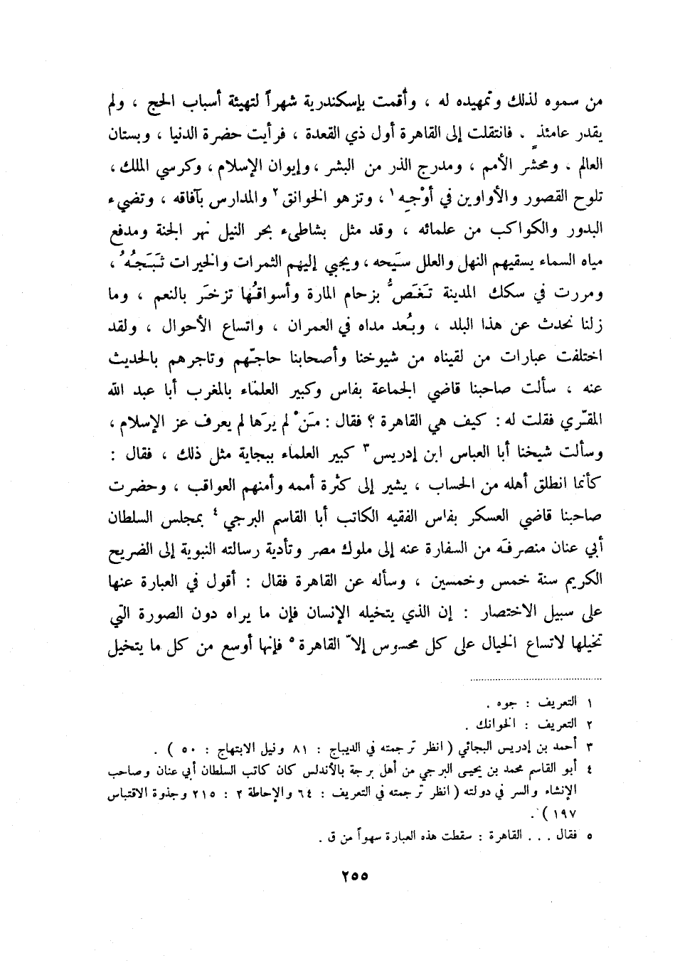 من سموه لذلك وتمهيده له، وأقمت بإسكندرية شهراً لتهيئة أسباب الحج، ولم يقدر عامئذ، فانتقلت إلى القاهرة أول ذي القعدة، فرأيت حضرة الدنيا، وبستان العالم، محشر الأمم، ومدرج الذر من البشر، وإيوان الإسلام، وكرسي الملك، تلوح القصور والأواوين في أوجه (1) ، وتزهو والخوانق (2) المدارس بآفاقه، وتضيء البدور والكواكب من علمائه، وقد مثل بشاطئ بحر النيل نهر الجنة ومدفع مياه السماء يسقيهم النهل والعلل سيحه، ويجبي إليهم الثمرات والخيرات ثبجه، ومررت في سكك المدينة تغص بزحام المارة وأسواقها تزخر بالنعم، وما زلنا نحدث عن هذا البلد، وبعد مداه في العمران، واتساع الأحوال، ولقد اختلفت عبارات من لقيناه من شيوخنا وأصحابنا حاجهم وتاجرهم بالحديث عنه، سألت صاحبنا قاضي الجماعة بفاس وكبير العلماء بالمغرب أبا عبد الله المقري فقلت له: كيف هي القاهة فقال: من لم يرها لم يعرف عز الإسلام، وسألت شيخنا أبا العباس ابن إدريس (3) كبير العلماء ببجاية مثل ذلك، فقال: كأنما انطلق أهله من الحساب، يشير إلى كثرة أممه وأمنهم العواقب، وحضرت صاحبنا قاضي العسكر بفاس الفقيه الكاتب أبا القاسم البرجي (4) بمجلس السلطان أبي عنان منصرفه من السفارة عنه إلى ملوك مصر وتأدية رسالته النبوية إلى الضريح الكريم سنة خمس وخمسين، وسأله عن القاهرة فقال: أقول في العبارة عنها على سبيل الاختصار: إن الذي يتخيله الإنسان فإن ما يراه دون الصورة التي تخيلها لاتساع الخيال على كل محسوس إلا القاهرة (1) فإنها أوسع من كل ما يتخيل