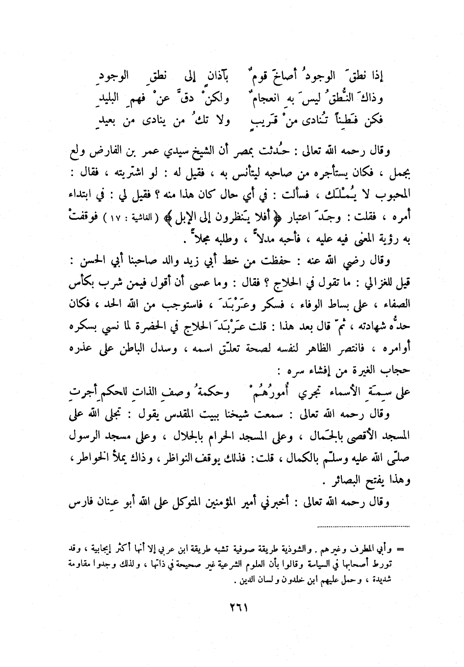فكن فطناُ تنادى من قريب ... ولا تك من ينادى من بعيد وقال رحمه الله تعالى: حدثت بمصر أن الشيخ سيدي عمر بن الفارض ولع بجمل، فكان يستأجره من صاحبه ليتأنس به، فقيل له: لو اشتريته، فقال: المحبوب لا يملك، فسألت: في أي حال كان هذا منه فقيل لي: في ابتداء أمره، فقلت: وجد اعتبار {أفلا ينظرون إلى الإبل} (الغاشية: 17) فوقفت به رؤية المعنى فيه عليه، فأحبه مدلاً، وطلبه مجلاُ.