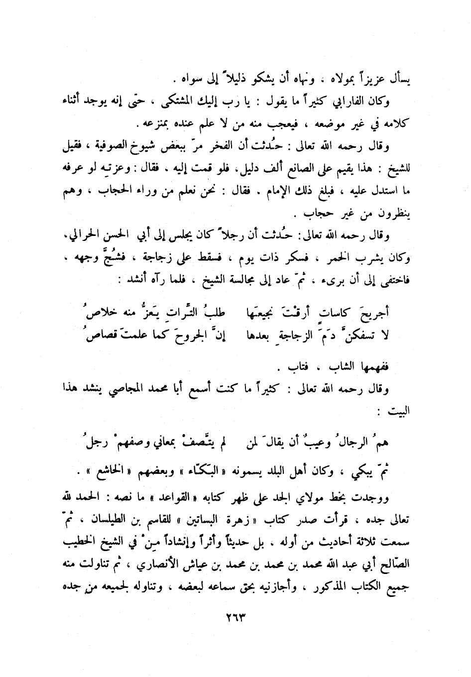 ووجدت بخط مولاي الجد على ظهر كتابه " القواعد " ما نصه: الحمد لله تعالى جده، قرأت صدر الكتاب " زهرة البساتين " للقاسم بن الطيلسان، ثم سمعت ثلاثة أحاديث من أوله، بل حديثاُ وأثراُ وإنشاداُ من في الشيخ الخطيب الصالح أبي عبد الله محمد بن محمد بن محمد بن عياش الأنصاري، ثم تناولت منه جميع الكتاب المذكور، وأجازنيه بحق سماعه لبعضه، وتناوله لجميعه من جده