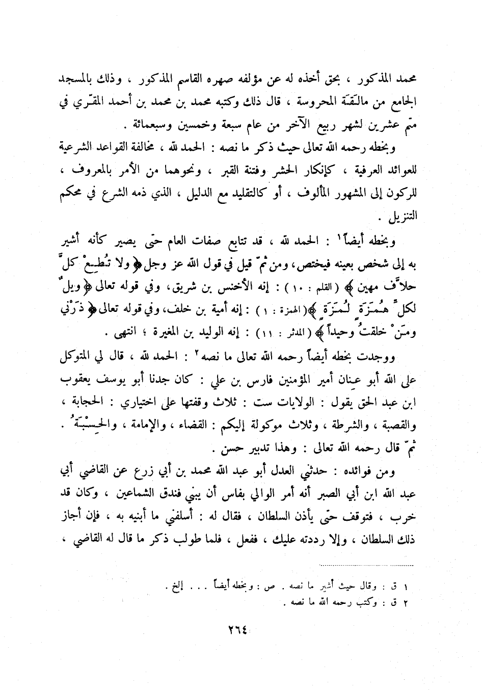 وبخطه رحمه الله تعالى حيث ذكر ما نصه: الحمد لله، مخالف القواعد الشرعية للعوائد العرفية، كإنكار الحشر وفتنة القبر، ونهوهما من الأمر بالمعروف، للركون إلى المشهور المألوف، كالتقليد مع الدليل، الذي ذمه الشرع في محكم التنزيل.