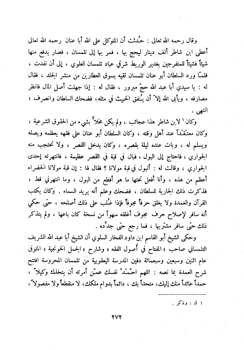 وكان (1) لابن شاطر هذا عجائب، ولم يكن مخلاً بشيء من الحقوق الشرعية، وكان معتقداً عند أهل وقته، وكان السلطان أبو عنان على فقهه يعظمه ويصله ويسلم له، وبات عنده ليلة بقصره، وكان يدخل القصر، ولا تحتجب منه الجواري، وقال له: أتبول في قبة مولانا فقال لها: إن قبة مولانا الخضراء أعظم من هذه، وأنا أفعل تحتها ما هو أفظع من البول، وما انتهرني قط، فذكرت ذلك الجارية للسلطان، فضحك وعلم أنه يريد السماء. وكان يكتب القرآن والعمدة ولا يغلق حرفاً مجوفاً فإذا غلب على ذلك أصلحه، حتى حكي أنه سافر لإصلاح حرف مجوف أغلقه سهواً من نسخة كان باعها، ولم يتذكر ذلك حتى سافر مشتريها، فما رجع حتى جدده.
