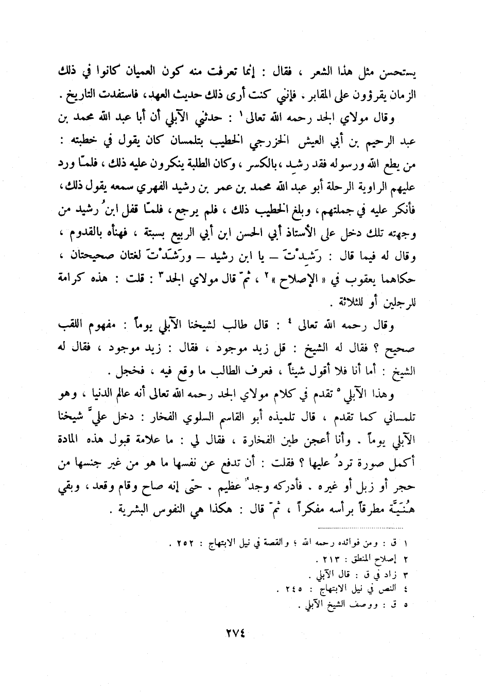 وقال مولاي الجد رحمه الله تعالى (1) : حدثني الآبلي أن أبا عبد الله محمد بن عبد الرحيم بن أبي العيش الخزرجي الخطيب بتلمسان كان يقول في خطبته: من يطع الله ورسوله فقد رشد، بالكسر، وكان الطلبة ينكرون عليه ذلك، فلما ورد عليهم الراوية الرحلة أبو عبد الله محمد بن عمر بن رشيد الفهري سمعه يقول ذلك، فأنكر عليه في جملتهم، وبلغ الخطيب ذلك، فلم يرجع، فلما قفل ابن رشيد من وجهته تلك دخل على الأستاذ أبي الحسن ابن البيع بسبتة، فهنأه بالقدوم، وقال له فيما قال: رشدت - يا ابن رشيد - ورشدت لغتان صحيحتان، حكاهما يعقوب في " الإصلاح " (2) ، ثم قال مولاي الجد (3) : قلت: هذه كرامة للرجلين أو للثلاثة.