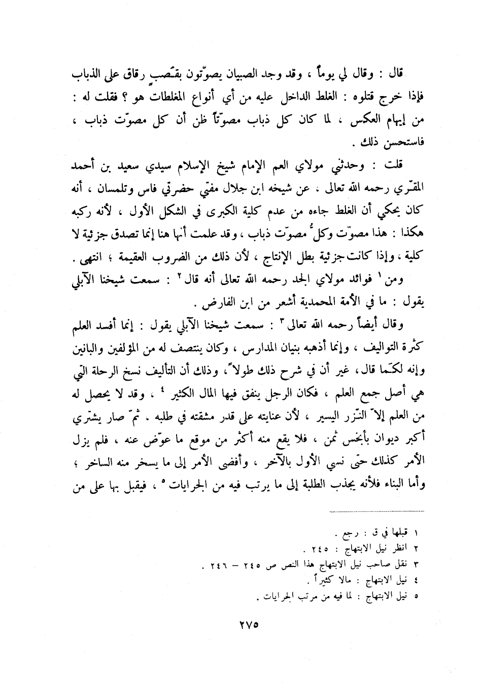 وقال أيضاً رحمه الله تعالى (3) : سمعت شيخنا الآبلي يقول: إنما أفسد العلم كثرة التواليف، وإنما أذهبه بنيان المدارس، وكان ينتصف له من المؤلفين والبانين وإنه لكما قال، غير أن في شرح ذلك طولاً، وذلك أن التأليف نسخ الرحلة التي هي أصل جمع العلم، فكلن الرجل ينفق فيها المال الكثير (4) ، وقد لا يحصل له من العلم إلا النزر اليسير، لأن عنايته على قدر مشقته في طلبه، ثم صار يشتري أكبر ديوان بأبخس ثمن، فلا يقع منه أكثر من موقع ما عوض عنه، فلم يزل الأمر كذلك حتى نسي الأول بالآخر، وأفضى الأمر إلى ما يسخر منه الساخر؛ وأما البناء فلأنه يجذب الطلبة إلى ما يرتب فيه الجرايات (5) ، فيقبل بها على من