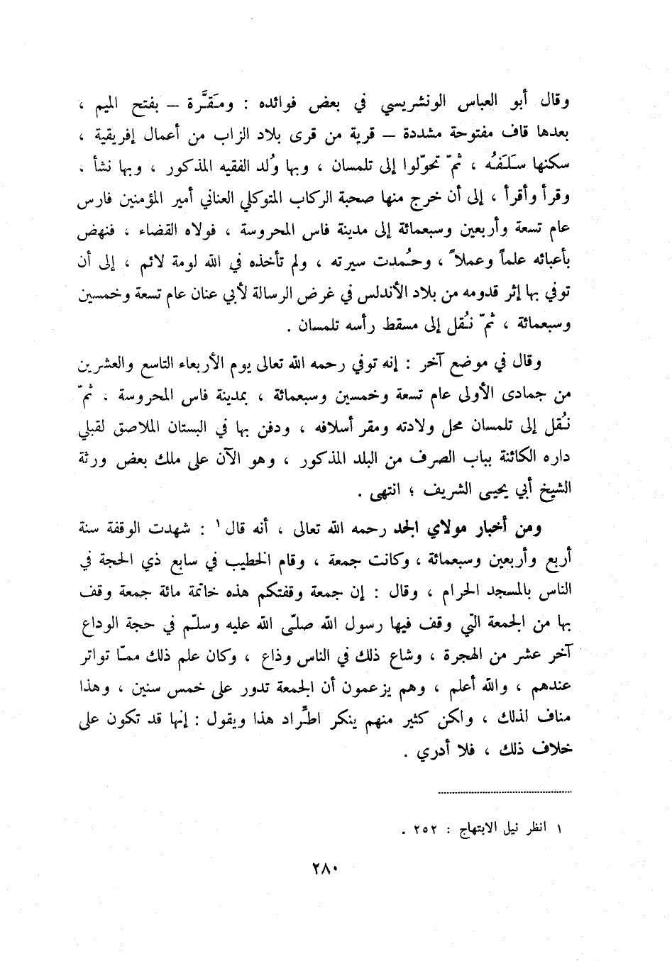 ومن أخبار مولاي الجد رحمه الله تعالى أنه قال (1) : شهدت الوقفة سنة أربع وأربعين وسبعمائة، وكانت جمعة، وقام الخطيب في سابع ذي الحجة في الناس بالمسجد الحرام، وقال: إن جمعة وقفتكم هذه خاتمة مائة جمعة وقف بها من الجمعة التي وقف فيها رسول الله صلى الله عليه وسلم في حجة الوداع آخر عشر من الهجرة، وشاع ذلك في الناس وذاع وكان علم ذلك مما تواتر عندهم، والله أعلم، وهم يزعمون أن الجمعة تدور على خمس سنين، وهذا مناف لذلك، ولكن كثير منهم ينكر اطراد هذا ويقول: إنها قد تكون على خلاف ذلك، فلا أدري.