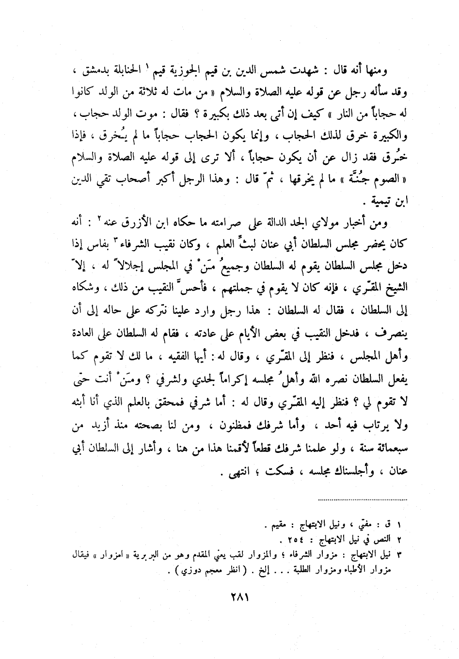 ومن أخبار مولاي الجد الدالة على صرامته ما حكاه ابن الأزرق عنه (2) : أنه كان يحضر مجلس السلطان أبي عنان لبث العلم، وكان نقيب الشرفاء (3) بفاس إذا دخل مجلس السلطان يقوم له السلطان وجميع من في المجلس إجلالاً له، إلا الشيخ المقري، فإنه كان لا يقوم في جملتهم، فأحس النقيب من ذلك، وشكاه إلى السلطان، فقال له السلطان: هذا رجل وارد علينا نتركه على حاله إلى أن ينصرف، فدخل النقيب في بعض الأيام على عادته، فقام له السلطان على العادة وأهل المجلس، فنظر إلى المقري، وقال له: أيها الفقيه، ما لك لا تقوم كما يفعل السلطان نصره الله وأهل مجلسه إكراماً لجدي ولشرفي ومن أنت حتى لا تقوم لي فنظر إليه المقري وقال له: أما شرفي فمحقق بالعلم الذي أنا أبثه ولا يرتاب فيه أحد، وأما شرفك فمظنون، ومن لنا بصحته منذ أزيد من سبعمائة سنة، ولو علمنا شرفك قطعاً لأقمنا هذا من هنا، وأشار إلى السلطان أبي عنان، وأجلسناك مجلسه، فسكت؛ انتهى.